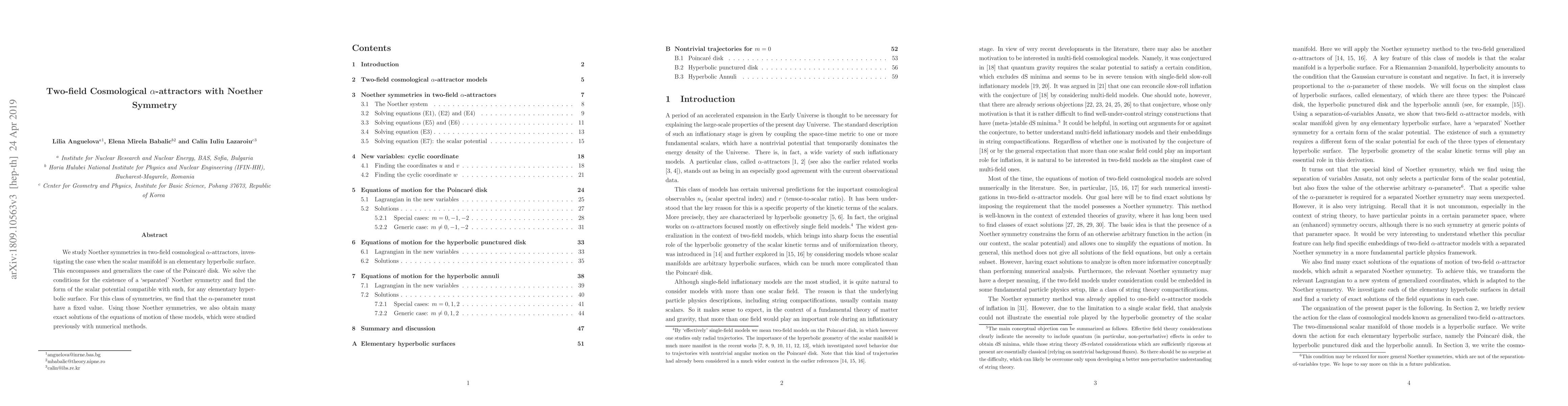This paper investigates Noether symmetries in two-field cosmological $\alpha$-attractors with an elementary hyperbolic scalar manifold, finding that the $\alpha$-parameter must be fixed. It also provides exact solutions for the equations of motion using these symmetries, extending previous numerical studies.