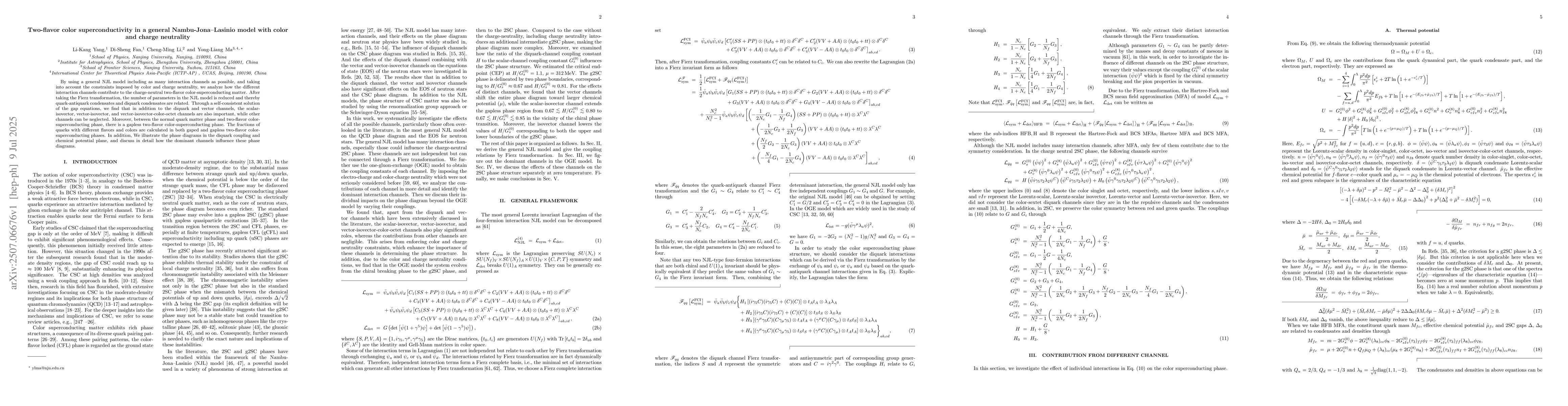 The paper presents a comprehensive analysis of the Nambu-Jona-Lasinio model, identifying and quantifying the contributions of various interaction channels to two-flavor color superconductivity under color and charge neutrality constraints.