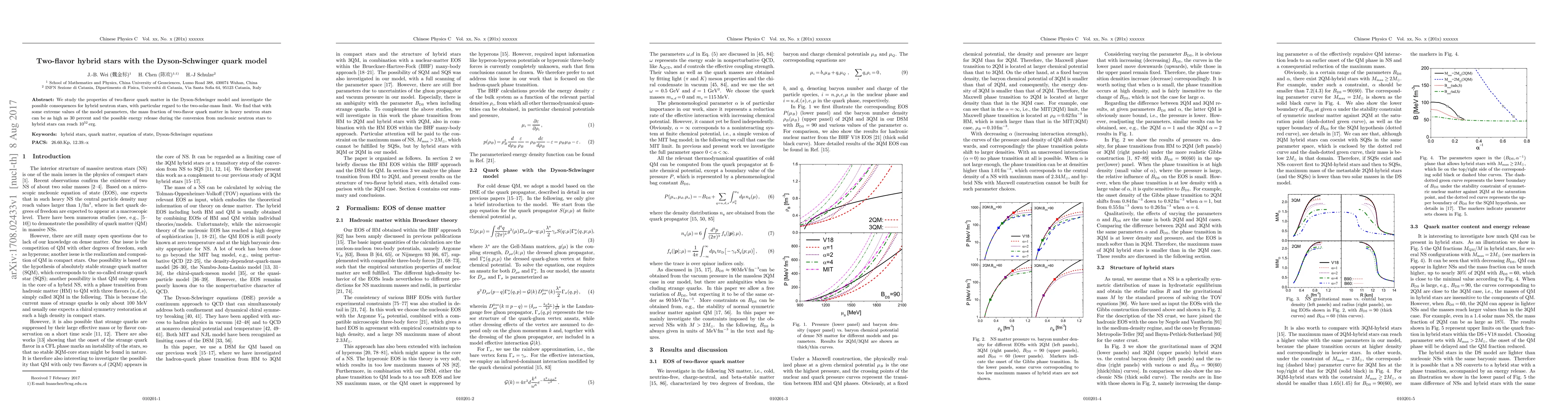 This paper explores the properties of two-flavor quark matter using the Dyson-Schwinger model and examines its implications for hybrid neutron stars, especially concerning their two-solar-mass limit. The study reveals that under certain parameter values, up to 30 percent of heavy neutron stars could consist of quark matter, with significant energy release of up to $10^{52}$ erg during the transition to hybrid stars.