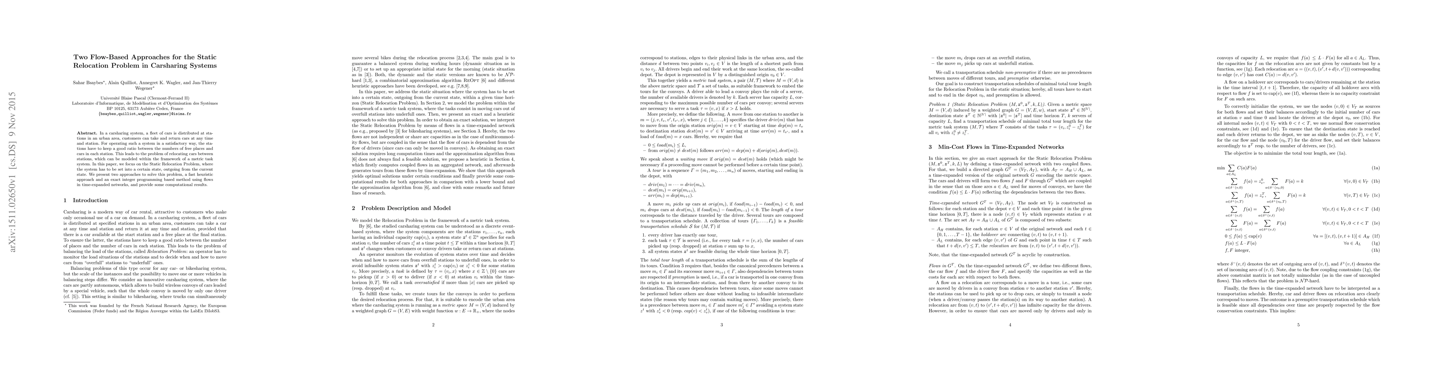This paper explores two methods for solving the Static Relocation Problem in carsharing systems: a fast heuristic approach and an exact integer programming method using flows in time-expanded networks. Computational results demonstrate the effectiveness of both approaches in optimizing the distribution of cars across stations.