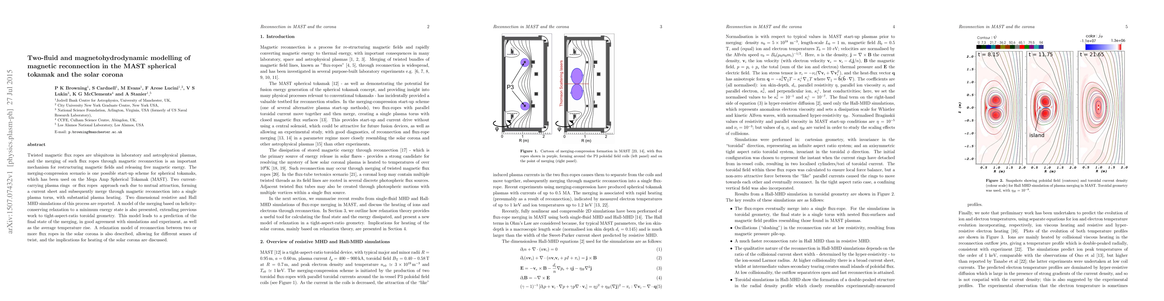 This paper presents two-fluid and magnetohydrodynamic modelling of magnetic reconnection in the MAST spherical tokamak and the solar corona, focusing on the merging of twisted magnetic flux ropes and the resultant plasma heating. The study includes 2D resistive and Hall MHD simulations, a relaxation theory model for predicting final states, and implications for solar corona heating.