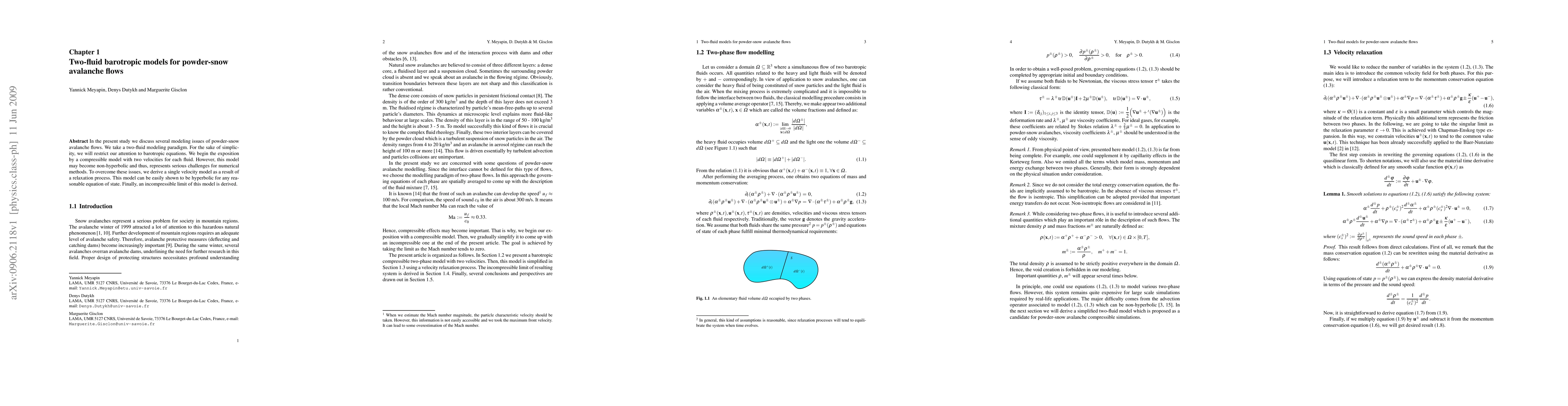 In the present study we discuss several modeling issues of powder-snow avalanche flows. We take a two-fluid modeling paradigm. For the sake of simplicity, we will restrict our attention to barotropic equations. We begin the exposition by a compressible model with two velocities for each fluid. However, this model may become non-hyperbolic and thus, represents serious challenges for numerical methods. To overcome these issues, we derive a single velocity model as a result of a relaxation process. This model can be easily shown to be hyperbolic for any reasonable equation of state. Finally, an incompressible limit of this model is derived.
