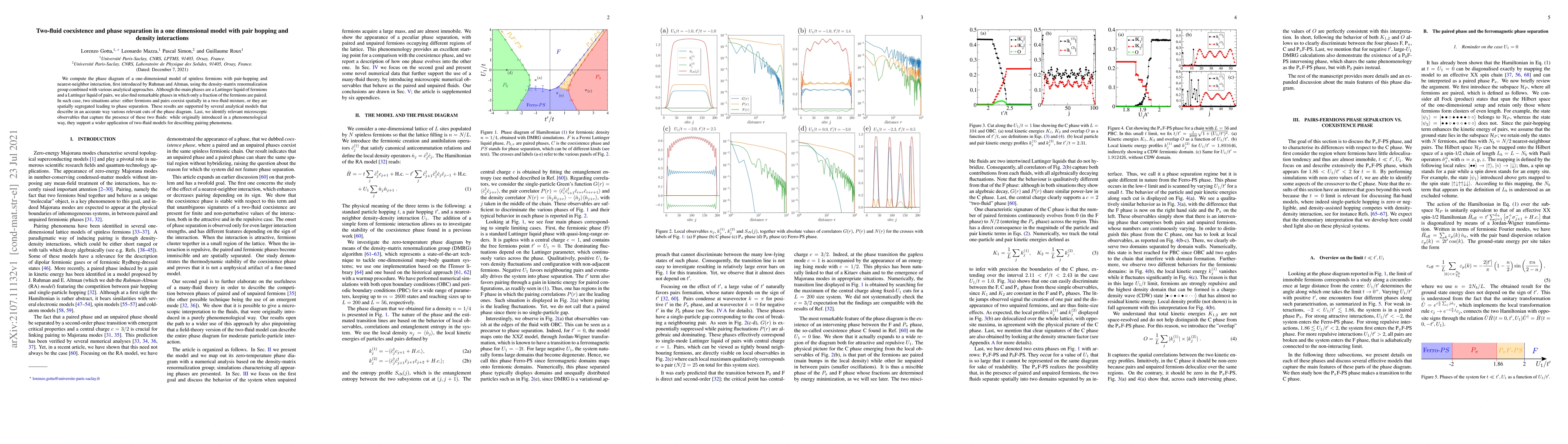 This paper investigates a one-dimensional model of spinless fermions with pair-hopping and density interactions, revealing coexistence and phase separation of fermions and pairs into two distinct fluids. Analytical models and density-matrix renormalization group methods support the findings, identifying relevant observables for describing pairing phenomena.