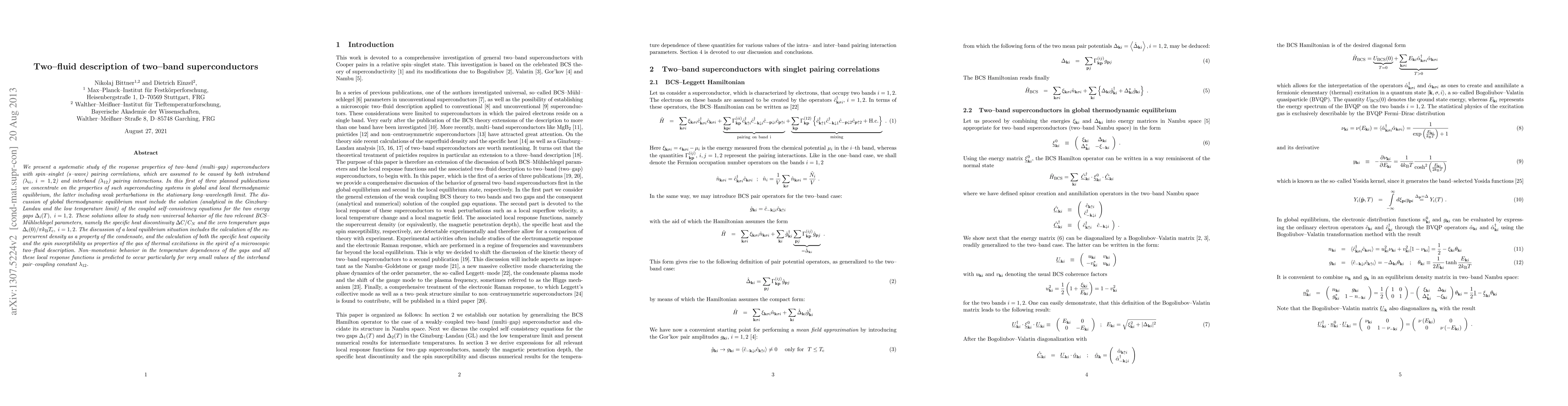 We present a systematic study of the response properties of two-band (multi-gap) superconductors with spin-singlet (s-wave) pairing correlations, which are assumed to be caused by both intraband (\lambda_{ii}, i=1,2) and interband (\lambda_{12}) pairing interactions. In this first of three planned publications we concentrate on the properties of such superconducting systems in global and local thermodynamic equilibrium, the latter including weak perturbations in the stationary long-wavelength limit. The discussion of global thermodynamic equilibrium must include the solution (analytical in the Ginzburg-Landau and the low temperature limit) of the coupled self-consistency equations for the two energy gaps \Delta_i(T), i=1,2. These solutions allow to study non-universal behavior of the two relevant BCS-M\"uhlschlegel parameters, namely the specific heat discontinuity \Delta C/C_N and the zero temperature gaps \Delta_i(0)/\pi k_B T_c, i=1,2. The discussion of a local equilibrium situation includes the calculation of the supercurrent density as a property of the condensate, and the calculation of both the specific heat capacity and the spin susceptibility as properties of the gas of thermal excitations in the spirit of a microscopic two-fluid description. Non-monotonic behavior in the temperature dependences of the gaps and all these local response functions is predicted to occur particularly for very small values of the interband pair-coupling constant \lambda_{12}.