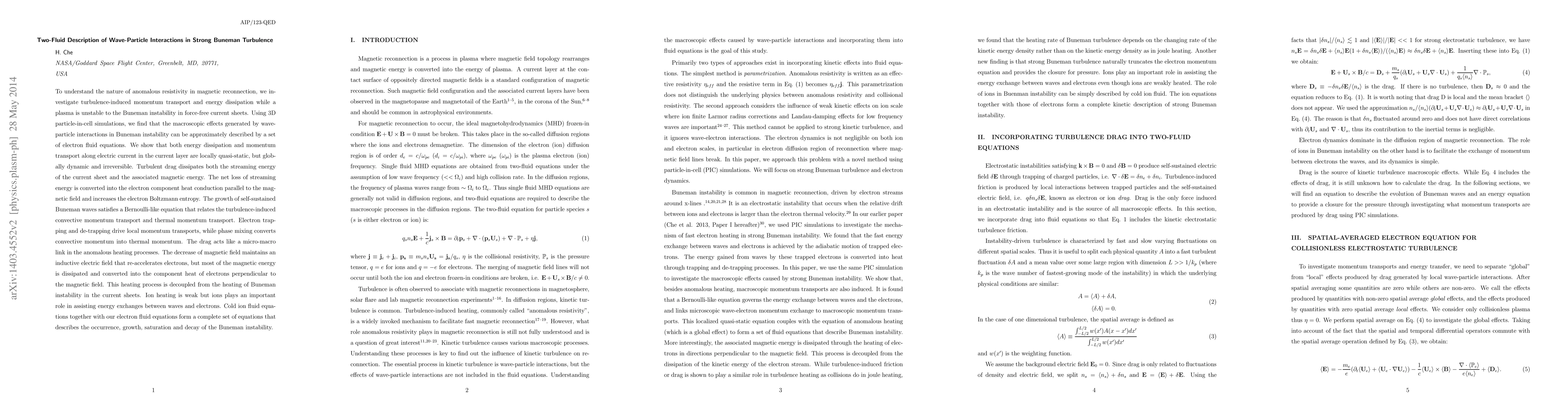 To understand the nature of anomalous resistivity in magnetic reconnection, we investigate turbulence-induced momentum transport and energy dissipation while a plasma is unstable to the Buneman instability in force-free current sheets. Using 3D particle-in-cell simulations, we find that the macroscopic effects generated by wave-particle interactions in Buneman instability can be approximately described by a set of electron fluid equations. We show that both energy dissipation and momentum transport along electric current in the current layer are locally quasi-static, but globally dynamic and irreversible. Turbulent drag dissipates both the streaming energy of the current sheet and the associated magnetic energy. The net loss of streaming energy is converted into the electron component heat conduction parallel to the magnetic field and increases the electron Boltzmann entropy. The growth of self-sustained Buneman waves satisfies a Bernoulli-like equation that relates the turbulence-induced convective momentum transport and thermal momentum transport. Electron trapping and de-trapping drive local momentum transports, while phase mixing converts convective momentum into thermal momentum. The drag acts like a micro-macro link in the anomalous heating processes. The decrease of magnetic field maintains an inductive electric field that re-accelerates electrons, but most of the magnetic energy is dissipated and converted into the component heat of electrons perpendicular to the magnetic field. This heating process is decoupled from the heating of Buneman instability in the current sheets. Ion heating is weak but ions plays an important role in assisting energy exchanges between waves and electrons. Cold ion fluid equations together with our electron fluid equations form a complete set of equations that describes the occurrence, growth, saturation and decay of the Buneman instability.