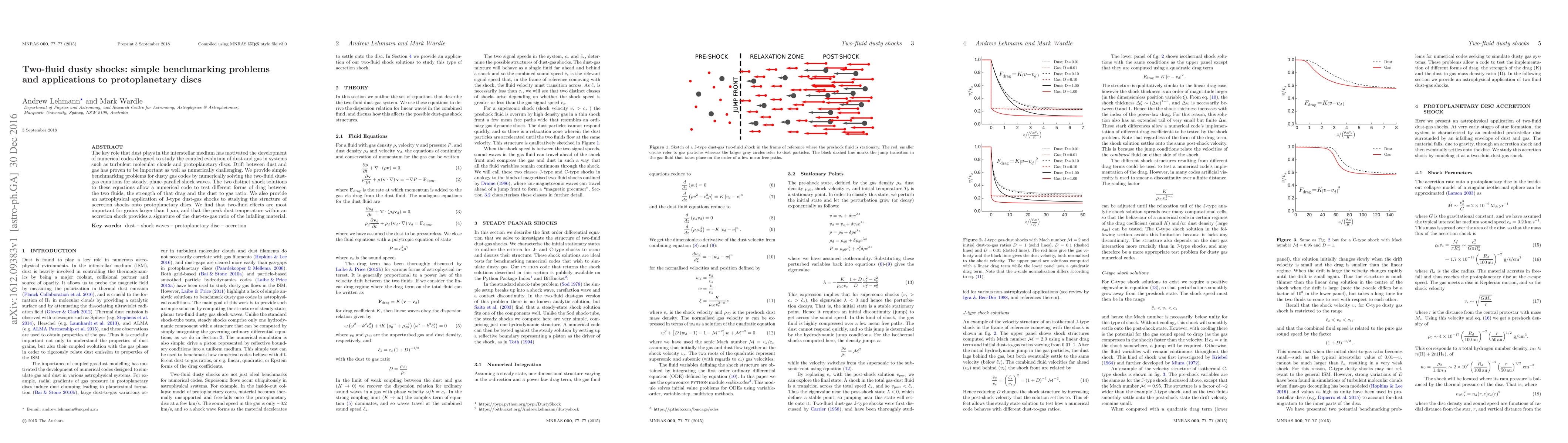 The key role that dust plays in the interstellar medium has motivated the development of numerical codes designed to study the coupled evolution of dust and gas in systems such as turbulent molecular clouds and protoplanetary discs. Drift between dust and gas has proven to be important as well as numerically challenging. We provide simple benchmarking problems for dusty gas codes by numerically solving the two-fluid dust-gas equations for steady, plane-parallel shock waves. The two distinct shock solutions to these equations allow a numerical code to test different forms of drag between the two fluids, the strength of that drag and the dust to gas ratio. We also provide an astrophysical application of J-type dust-gas shocks to studying the structure of accretion shocks onto protoplanetary discs. We find that two-fluid effects are most important for grains larger than 1 um, and that the peak dust temperature within an accretion shock provides a signature of the dust-to-gas ratio of the infalling material.
