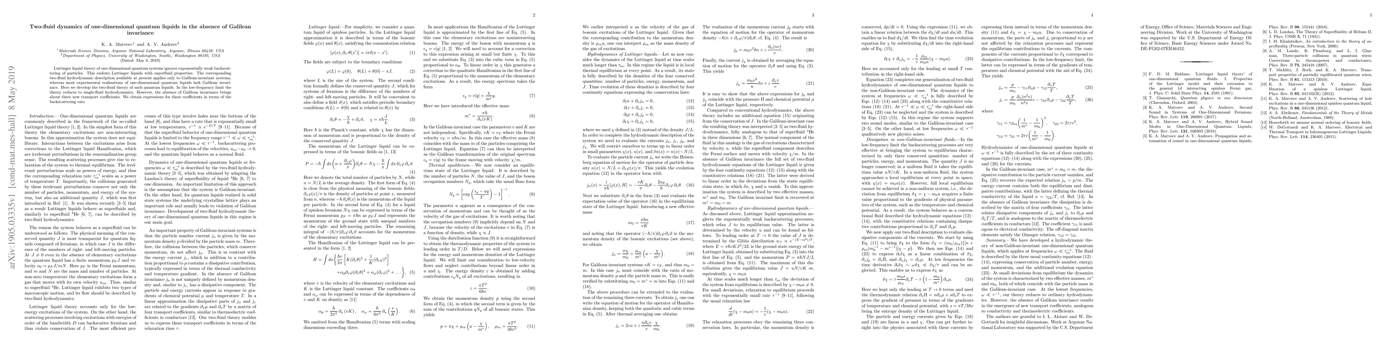 This paper develops a two-fluid hydrodynamic theory for one-dimensional quantum liquids that lack Galilean invariance, introducing three new transport coefficients absent in Galilean-invariant systems. The theory reduces to single-fluid hydrodynamics at low frequencies and expresses the new coefficients in terms of the backscattering rate.