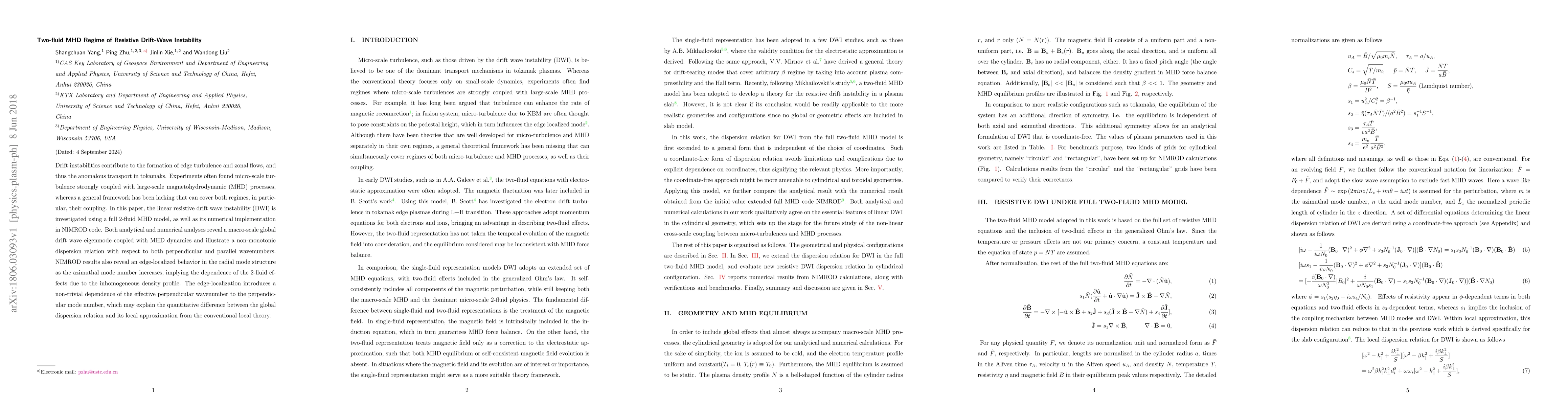 Drift instabilities contribute to the formation of edge turbulence and zonal flows, and thus the anomalous transport in tokamaks. Experiments often found micro-scale tur- bulence strongly coupled with large-scale magnetohydrodynamic (MHD) processes, whereas a general framework has been lacking that can cover both regimes, in partic- ular, their coupling. In this paper, the linear resistive drift wave instability (DWI) is investigated using a full 2-fluid MHD model, as well as its numerical implementation in NIMROD code. Both analytical and numerical analyses reveal a macro-scale global drift wave eigenmode coupled with MHD dynamics and illustrate a non-monotonic dispersion relation with respect to both perpendicular and parallel wavenumbers. NIMROD results also reveal an edge-localized behavior in the radial mode structure as the azimuthal mode number increases, implying the dependence of the 2-fluid ef- fects due to the inhomogeneous density profile. The edge-localization introduces a non-trivial dependence of the effective perpendicular wavenumber to the perpendicular mode number, which may explain the quantitative difference between the global dispersion relation and its local approximation from the conventional local theory.