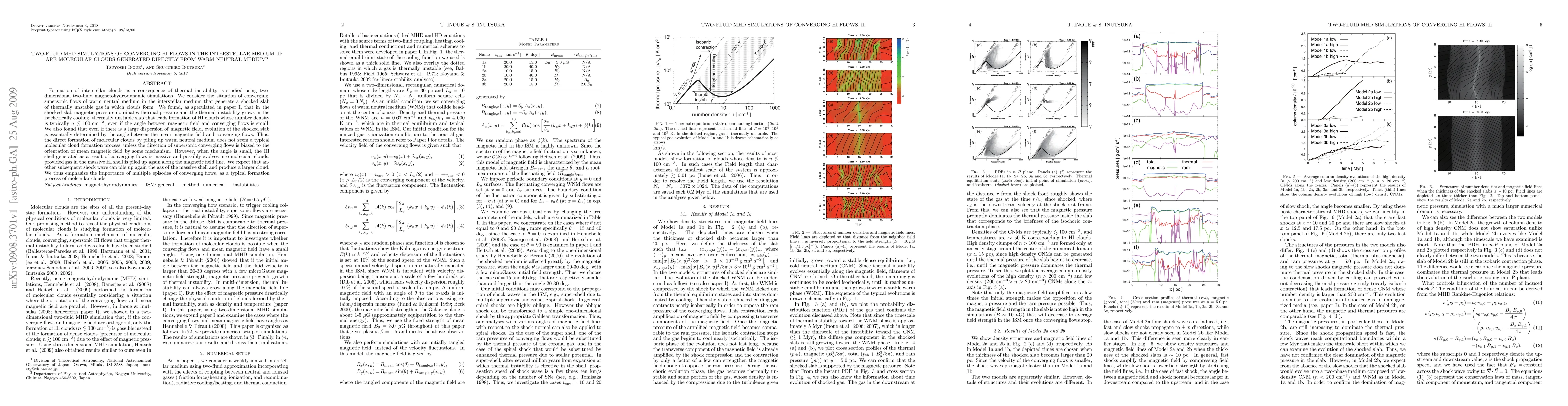 Formation of interstellar clouds as a consequence of thermal instability is studied using two-dimensional two-fluid magnetohydrodynamic simulations. We consider the situation of converging, supersonic flows of warm neutral medium in the interstellar medium that generate a shocked slab of thermally unstable gas in which clouds form. We found, as speculated in paper I, that in the shocked slab magnetic pressure dominates thermal pressure and the thermal instability grows in the isochorically cooling, thermally unstable slab that leads formation of HI clouds whose number density is typically n < 100 cm^-3, even if the angle between magnetic field and converging flows is small. We also found that even if there is a large dispersion of magnetic field, evolution of the shocked slab is essentially determined by the angle between the mean magnetic field and converging flows. Thus, the direct formation of molecular clouds by piling up warm neutral medium does not seem a typical molecular cloud formation process, unless the direction of supersonic converging flows is biased to the orientation of mean magnetic field by some mechanism. However, when the angle is small, the HI shell generated as a result of converging flows is massive and possibly evolves into molecular clouds, provided gas in the massive HI shell is piled up again along the magnetic field line. We expect that another subsequent shock wave can pile up again the gas of the massive shell and produce a larger cloud. We thus emphasize the importance of multiple episodes of converging flows, as a typical formation process of molecular clouds.