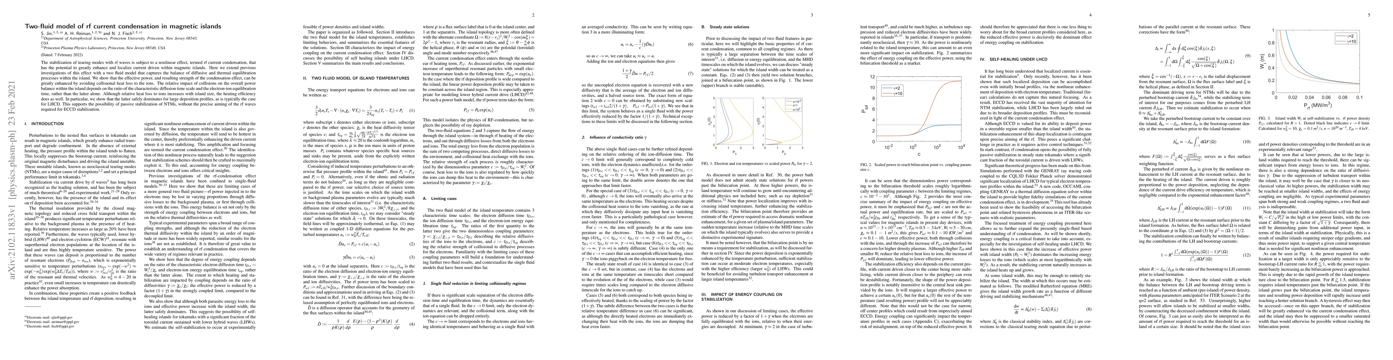 This paper investigates the stabilization of tearing modes using rf waves, focusing on the nonlinear effect of rf current condensation within magnetic islands. A two-fluid model reveals that avoiding collisional heat loss to ions can significantly enhance the effective power and strength of the condensation effect, supporting passive stabilization of magnetic islands without precise rf wave aiming.
