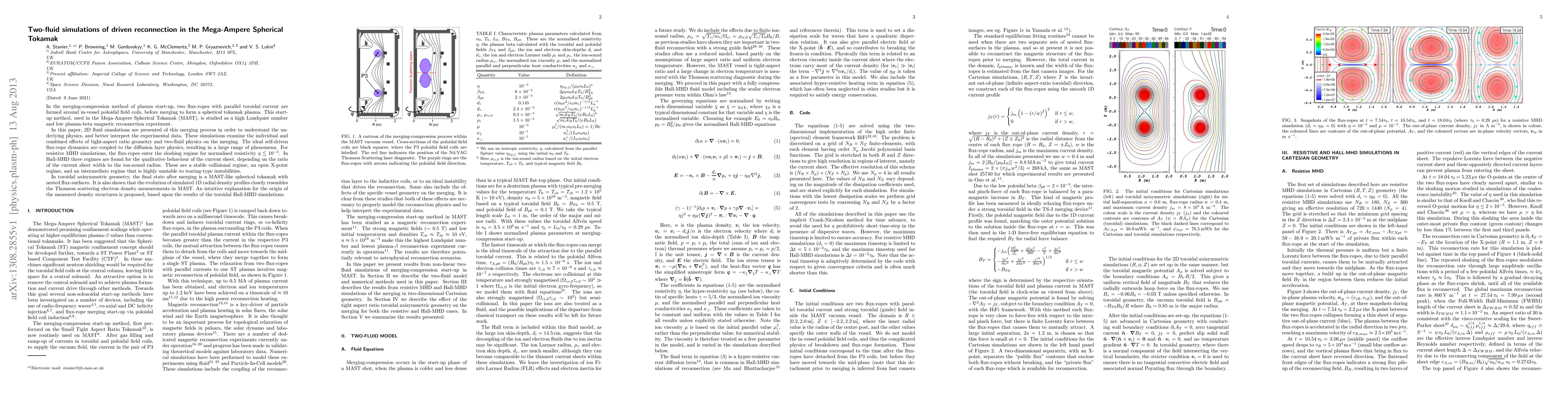 In the merging-compression method of plasma start-up, two flux-ropes with parallel toroidal current are formed around in-vessel poloidal field coils, before merging to form a spherical tokamak plasma. This start-up method, used in the Mega-Ampere Spherical Tokamak (MAST), is studied as a high Lundquist number and low plasma-beta magnetic reconnection experiment. In this paper, 2D fluid simulations are presented of this merging process in order to understand the underlying physics, and better interpret the experimental data. These simulations examine the individual and combined effects of tight-aspect ratio geometry and two-fluid physics on the merging. The ideal self-driven flux-rope dynamics are coupled to the diffusion layer physics, resulting in a large range of phenomena. For resistive MHD simulations, the flux-ropes enter the sloshing regime for normalised resistivity eta < 1E-5. In Hall-MHD three regimes are found for the qualitative behaviour of the current sheet, depending on the ratio of the current sheet width to the ion-sound radius. These are a stable collisional regime, an open X-point regime, and an intermediate regime that is highly unstable to tearing-type instabilities. In toroidal axisymmetric geometry, the final state after merging is a MAST-like spherical tokamak with nested flux-surfaces. It is also shown that the evolution of simulated 1D radial density profiles closely resembles the Thomson scattering electron density measurements in MAST. An intuitive explanation for the origin of the measured density structures is proposed, based upon the results of the toroidal Hall-MHD simulations.
