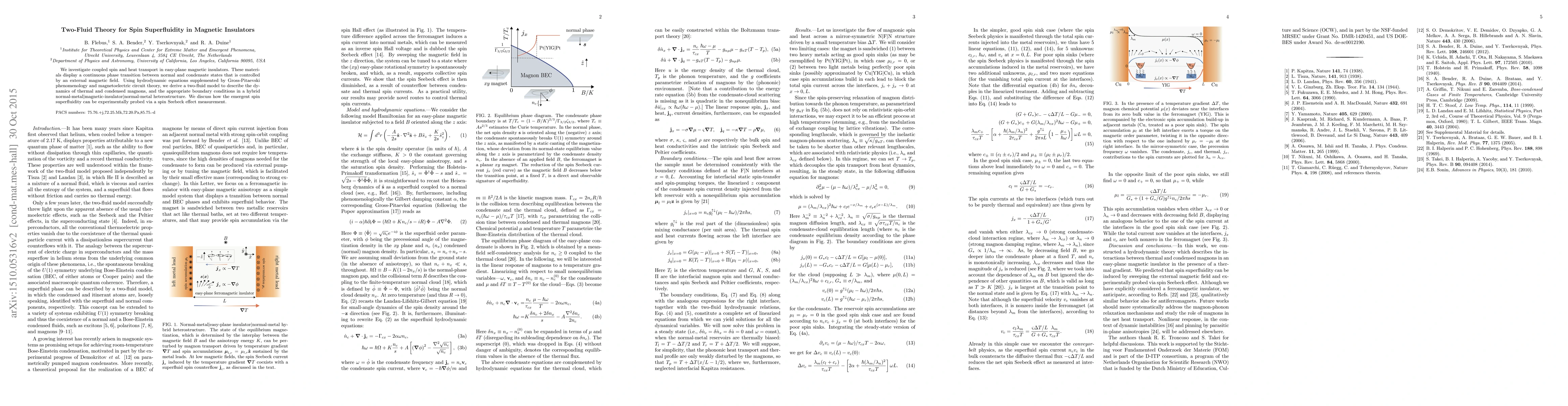 We investigate coupled spin and heat transport in easy-plane magnetic insulators. These materials display a continuous phase transition between normal and condensate states that is controlled by an external magnetic field. Using hydrodynamic equations supplemented by Gross-Pitaevski phenomenology and magnetoelectric circuit theory, we derive a two-fluid model to describe the dynamics of thermal and condensed magnons, and the appropriate boundary conditions in a hybrid normal-metal|magnetic-insulator|normal-metal heterostructure. We discuss how the emergent spin superfluidity can be experimentally probed via a spin Seebeck effect measurement.