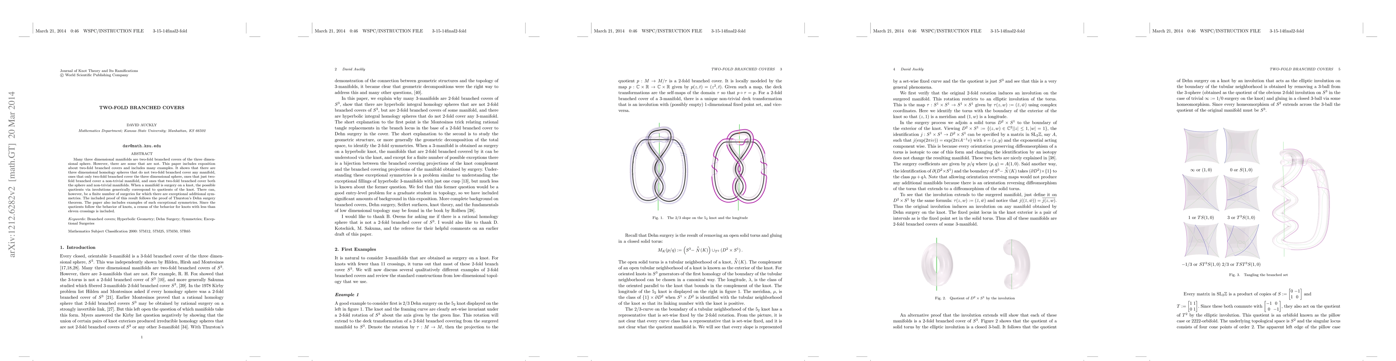 This paper explores three-dimensional manifolds that are two-fold branched covers of the three-dimensional sphere, identifying various types of such manifolds and their exceptional symmetries. It provides examples and proofs, including a census of knot behaviors for knots with fewer than eleven crossings.