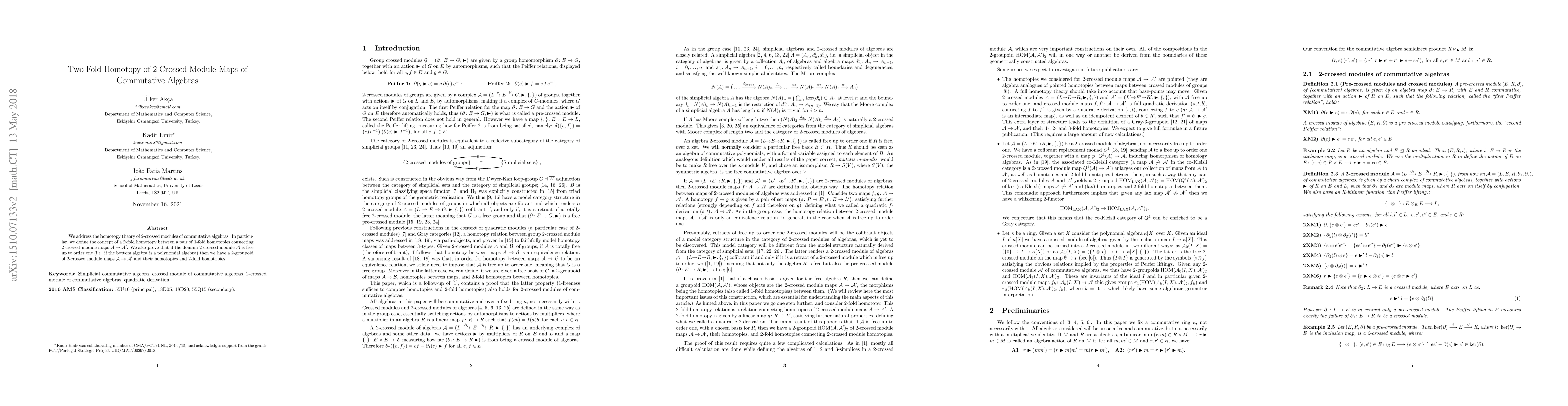 This paper introduces the notion of a 2-fold homotopy between 1-fold homotopies of 2-crossed module maps between commutative algebras. It establishes a 2-groupoid structure for these maps and their homotopies when the domain module is free up to order one.