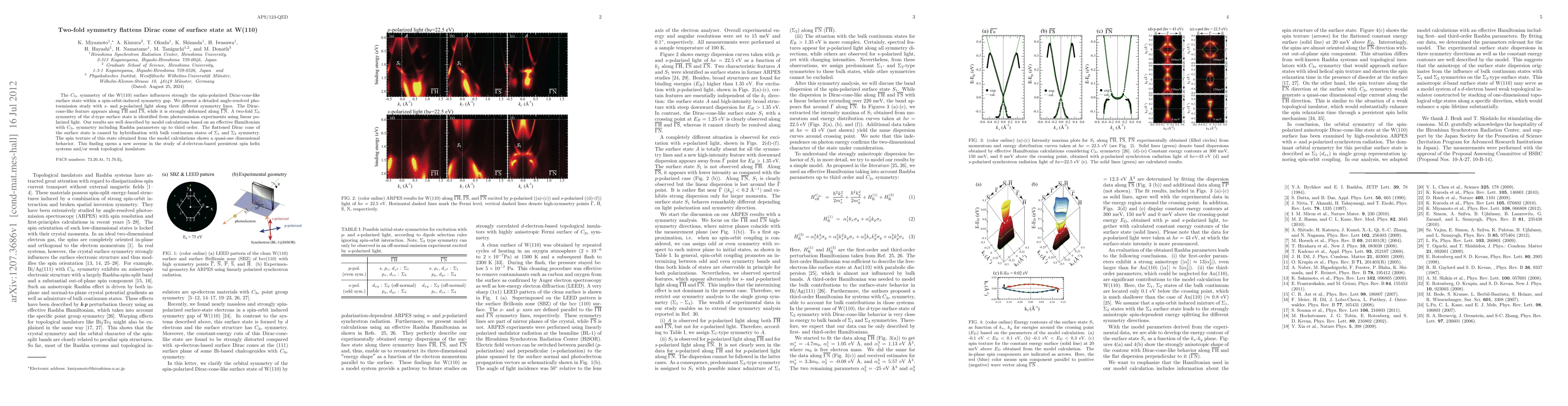 The $C_{2v}$ symmetry of the W(110) surface influences strongly the spin-polarized Dirac-cone-like surface state within a spin-orbit-induced symmetry gap. We present a detailed angle-resolved photoemission study with $s$- and $p$-polarized light along three different symmetry lines. The Dirac-cone-like feature appears along $\bar{\Gamma}\bar{H}$ and $\bar{\Gamma}\bar{S}$, while it is strongly deformed along $\bar{\Gamma}\bar{N}$. A two-fold $\Sigma_{3}$ symmetry of the $d$-type surface state is identified from photoemission experiments using linear polarized light. Our results are well described by model calculations based on an effective Hamiltonian with $C_{2v}$ symmetry including Rashba parameters up to third order. The flattened Dirac cone of the surface state is caused by hybridization with bulk continuum states of $\Sigma_{1}$ and $\Sigma_{2}$ symmetry. The spin texture of this state obtained from the model calculations shows a quasi-one dimensional behavior. This finding opens a new avenue in the study of $d$-electron-based persistent spin helix systems and/or weak topological insulators.