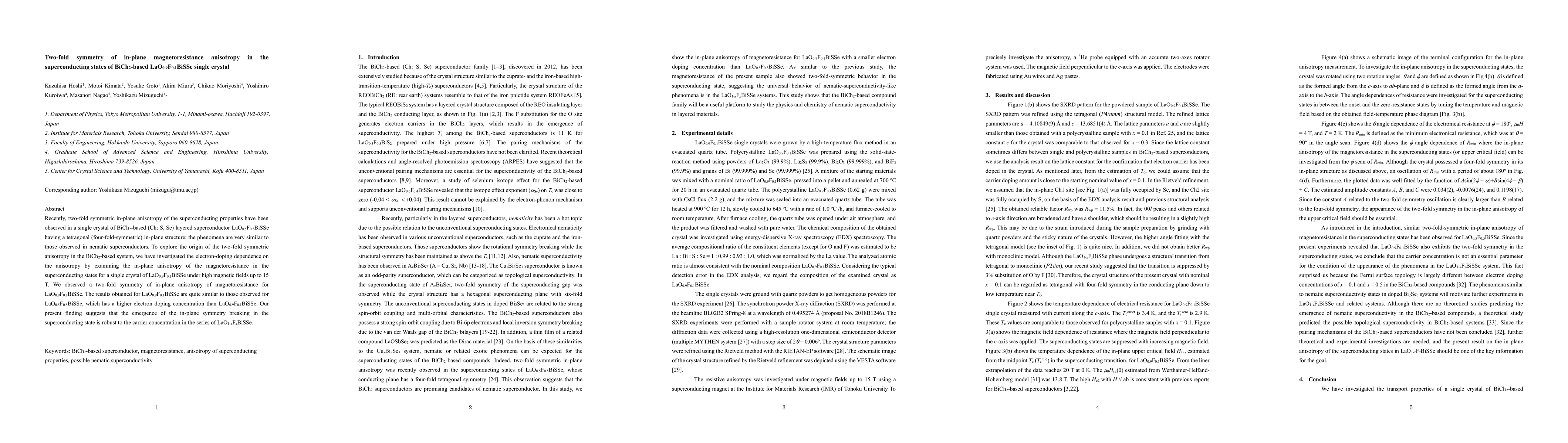 The research investigates the origin of two-fold symmetric anisotropy in BiCh2-based superconductor LaO0.9F0.1BiSSe. By examining the in-plane anisotropy of magnetoresistance under high magnetic fields, similar two-fold symmetry was observed in LaO0.9F0.1BiSSe and LaO0.5F0.5BiSSe. The findings suggest that this in-plane symmetry breaking in the superconducting state is robust against carrier concentration changes in the LaO1-xFxBiSSe series.