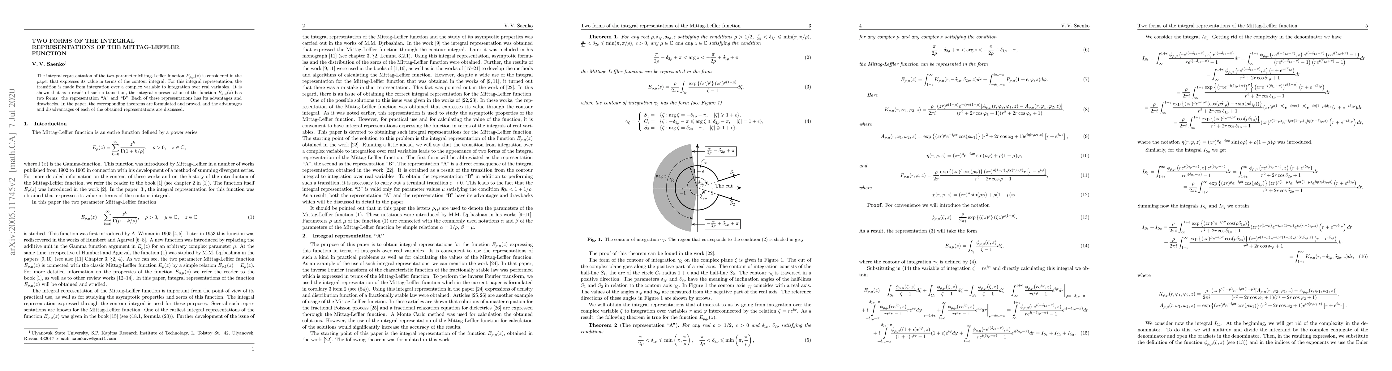 The integral representation of the two-parameter Mittag-Leffler function $E_{\rho,\mu}(z)$ is considered in the paper that expresses its value in terms of the contour integral. For this integral representation, the transition is made from integration over a complex variable to integration over real variables. It is shown that as a result of such a transition, the integral representation of the function $E_{\rho,\mu}(z)$ has two forms: the representation ``A'' and ``B''. Each of these representations has its advantages and drawbacks. In the paper, the corresponding theorems are formulated and proved, and the advantages and disadvantages of each of the obtained representations are discussed.