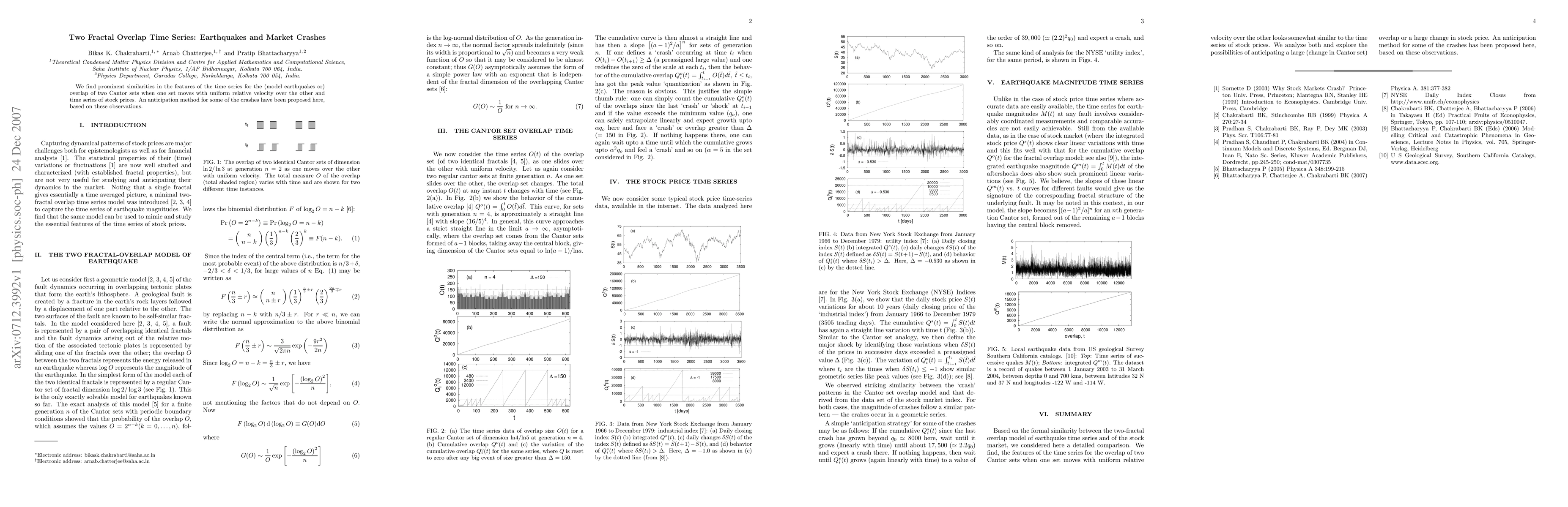 We find prominent similarities in the features of the time series for the (model earthquakes or) overlap of two Cantor sets when one set moves with uniform relative velocity over the other and time series of stock prices. An anticipation method for some of the crashes have been proposed here, based on these observations.