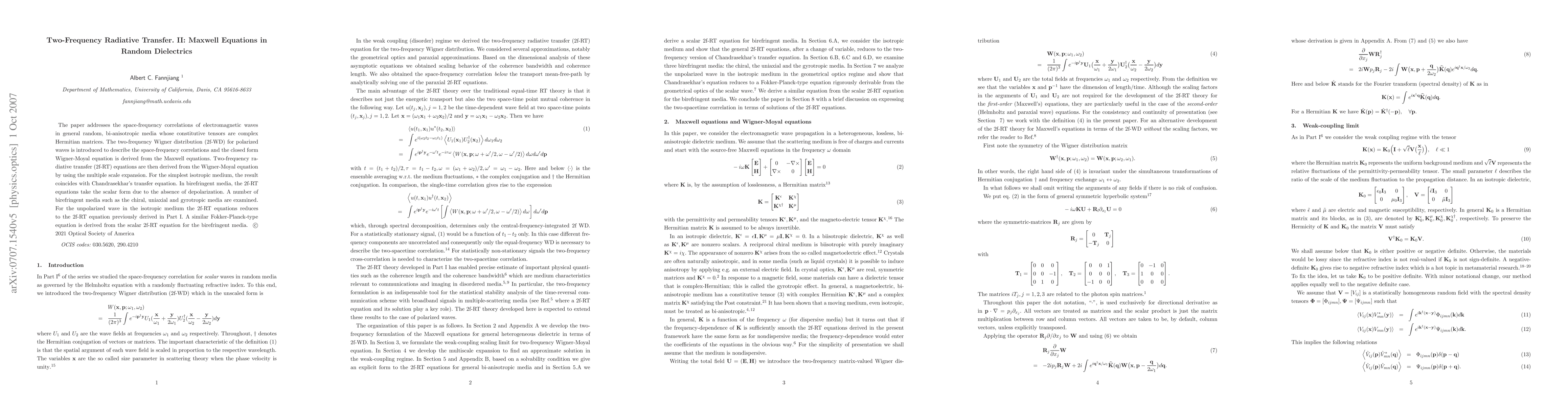 The paper addresses the space-frequency correlations of electromagnetic waves in general random, bi-anisotropic media whose constitutive tensors are complex Hermitian matrices. The two-frequency Wigner distribution (2f-WD) for polarized waves is introduced to describe the space-frequency correlations and the closed form Wigner-Moyal equation is derived from the Maxwell equations. Two-frequency radiative transfer (2f-RT) equations is then derived from the Wigner-Moyal equation by using the multiple scale expansion. For the simplest isotropic medium, the result coincides with Chandrasekhar's transfer equation. In birefringent media, the 2f-RT equations take the scalar form due to the absence of depolarization. A number of birefringent media such as the chiral, uniaxial and gyrotropic media are examined. For the unpolarized wave in the isotropic medium the 2f-RT equations reduces to the Fokker-Planck equation previously derived in Part I. A similar Fokker-Planck equation is derived from the scalar 2f-RT equation for the birefringent media.