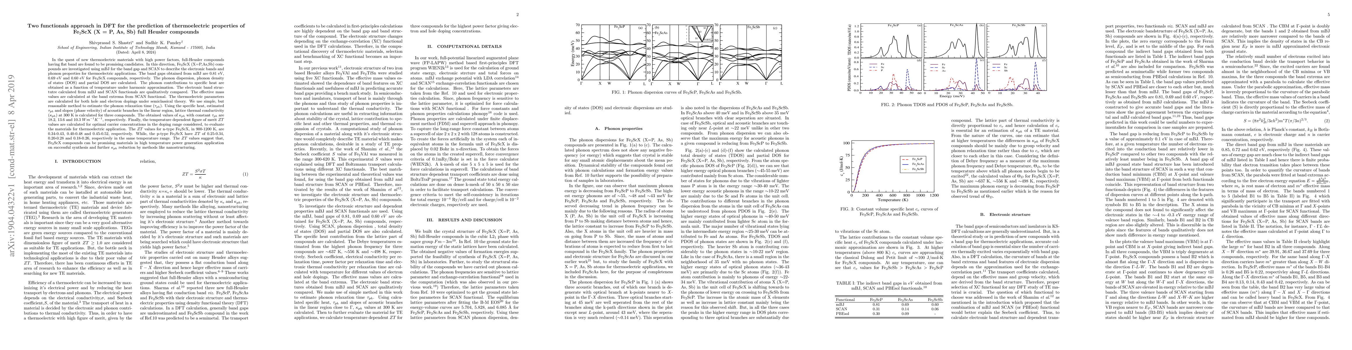 In the quest of new thermoelectric (TE) materials with high power factors, full-Heusler compounds having flat band are found to be promising candidates. In this direction, Fe$_{2}$ScX (X=P,As,Sb) compounds are investigated using mBJ for the band gap and SCAN to describe the electronic bands and phonon properties for TE applications. The band gaps obtained from mBJ are 0.81 eV, 0.69 eV and 0.60 eV for Fe$_{2}$ScX compounds, respectively. The phonon dispersion, phonon density of states (DOS) and partial DOS are calculated. The phonon contributions to specific heat are obtained as a function of temperature under harmonic approximation. The electronic band structutre calculated from mBJ and SCAN functionals are qualitatively compared. The TE parameters are calculated for both hole and electron dopings under semiclassical theory. We use simple, but reasonable method to estimate phonon relaxation time ($\tau_{ph}$). Using the specific heat, estimated $\tau_{ph}$ and slopes (phase velocity) of acoustic branches in the linear region, lattice thermal conductivity ($\kappa_{ph}$) at 300 K is calculated for three compounds. The obtained values of $\kappa_{ph}$ with constant $\tau_{ph}$ are 18.2, 13.6 and 10.3 $Wm^{-1}K^{-1}$, respectively. Finally, the temperature dependent figure of merit $ZT$ values are calculated for optimal carrier concentrations in the doping range considered, to evaluate the materials for TE application. The $ZT$ values for n-type Fe$_{2}$ScX, in 900-1200 K, are 0.34-0.43, 0.40-0.48 and 0.45-0.52, respectively. While, the p-type Fe$_{2}$ScX have $ZT$ of 0.25-0.34, 0.20-0.28 and 0.18-0.26, respectively in the same temperature range. The $ZT$ values suggest that, Fe$_{2}$ScX compounds can be promising materials in high temperature power generation application on successful synthesis and further $\kappa_{ph}$ reduction by methods like nanostructuring.