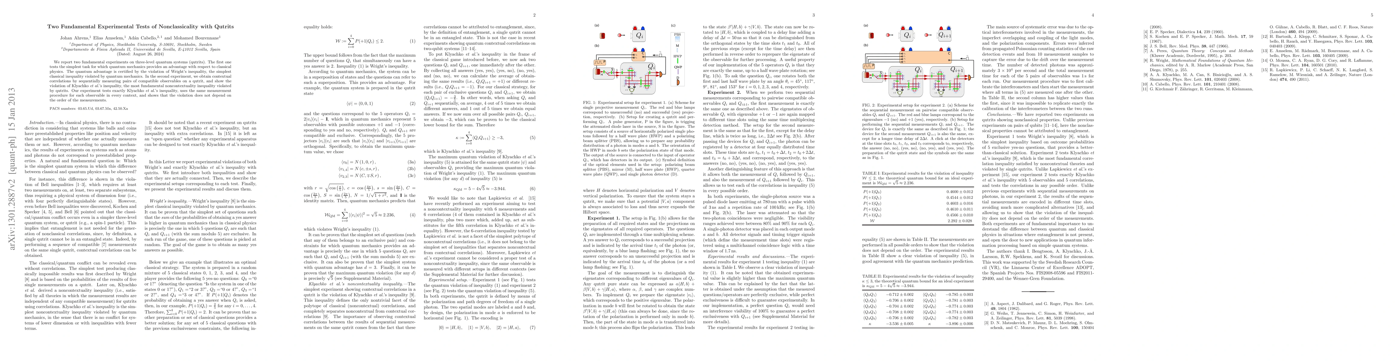 This paper presents two experiments on three-level quantum systems (qutrits) to demonstrate nonclassicality: one certifies quantum advantage via Wright's inequality violation, while the other reveals contextual correlations by violating Klyachko et al.'s inequality, showing independence from measurement order.