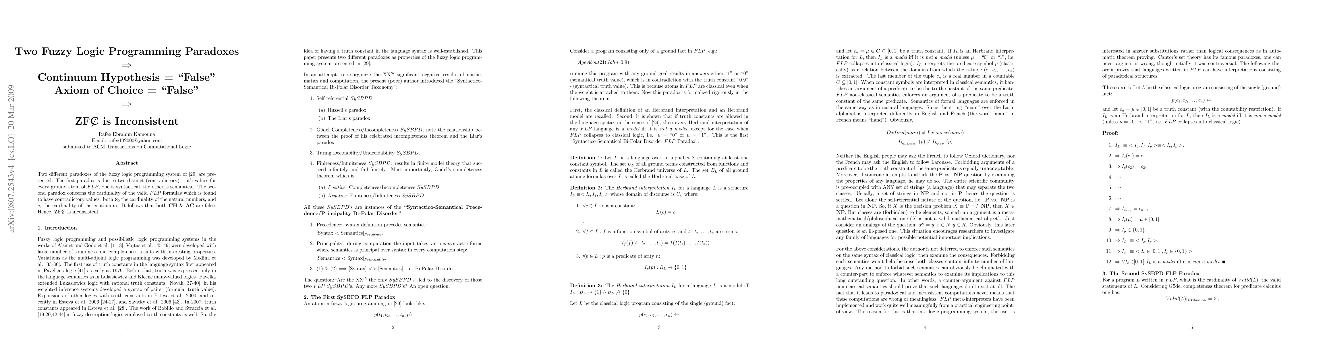 Two different paradoxes of the fuzzy logic programming system of [29] are presented. The first paradox is due to two distinct (contradictory) truth values for every ground atom of FLP, one is syntactical, the other is semantical. The second paradox concerns the cardinality of the valid FLP formulas which is found to have contradictory values: both $\aleph_0$ the cardinality of the natural numbers, and $c$, the cardinality of the continuum. The result is that CH="False" and Axiom of Choice="False". Hence, ZFC is inconsistent.