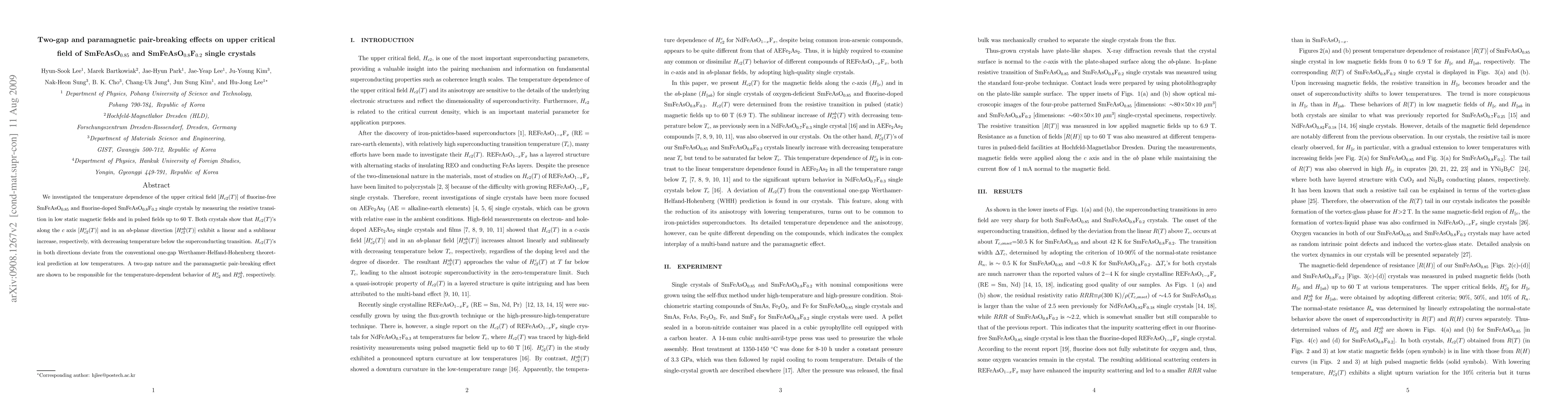 We investigated the temperature dependence of the upper critical field [$H_{c2}(T)$] of fluorine-free SmFeAsO$_{0.85}$ and fluorine-doped SmFeAsO$_{0.8}$F$_{0.2}$ single crystals by measuring the resistive transition in low static magnetic fields and in pulsed fields up to 60 T. Both crystals show that $H_{c2}(T)$'s along the c axis [$H_{c2}^c(T)$] and in an $ab$-planar direction [$H_{c2}^{ab}(T)$] exhibit a linear and a sublinear increase, respectively, with decreasing temperature below the superconducting transition. $H_{c2}(T)$'s in both directions deviate from the conventional one-gap Werthamer-Helfand-Hohenberg theoretical prediction at low temperatures. A two-gap nature and the paramagnetic pair-breaking effect are shown to be responsible for the temperature-dependent behavior of $H_{c2}^c$ and $H_{c2}^{ab}$, respectively.