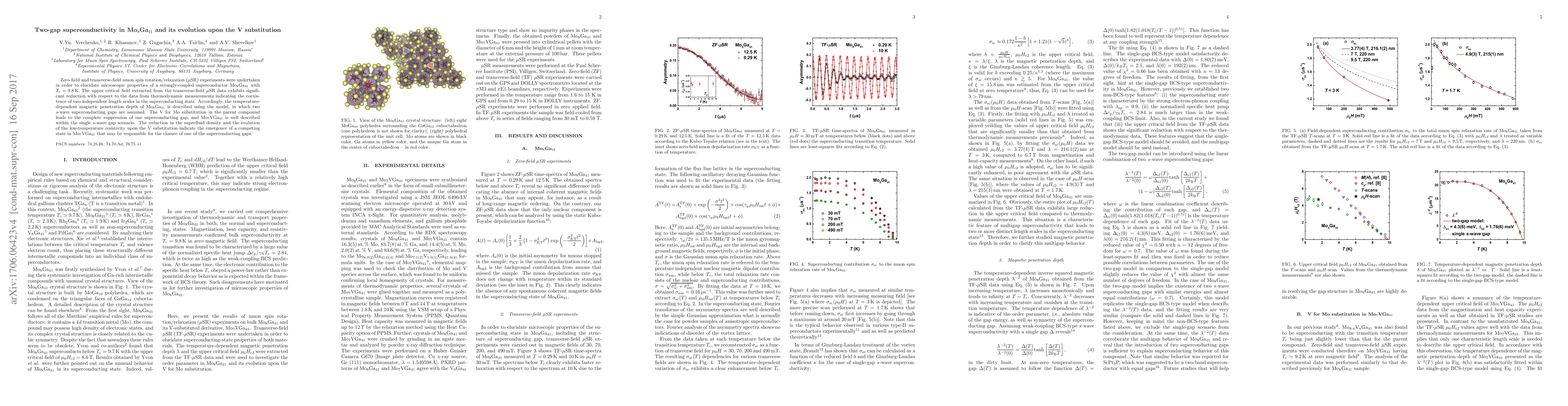 Researchers discovered two-gap superconductivity in Mo$_{8}$Ga$_{41}$, a material with a high critical temperature of 9.8 K, which is disrupted when the element V is substituted into the parent compound.