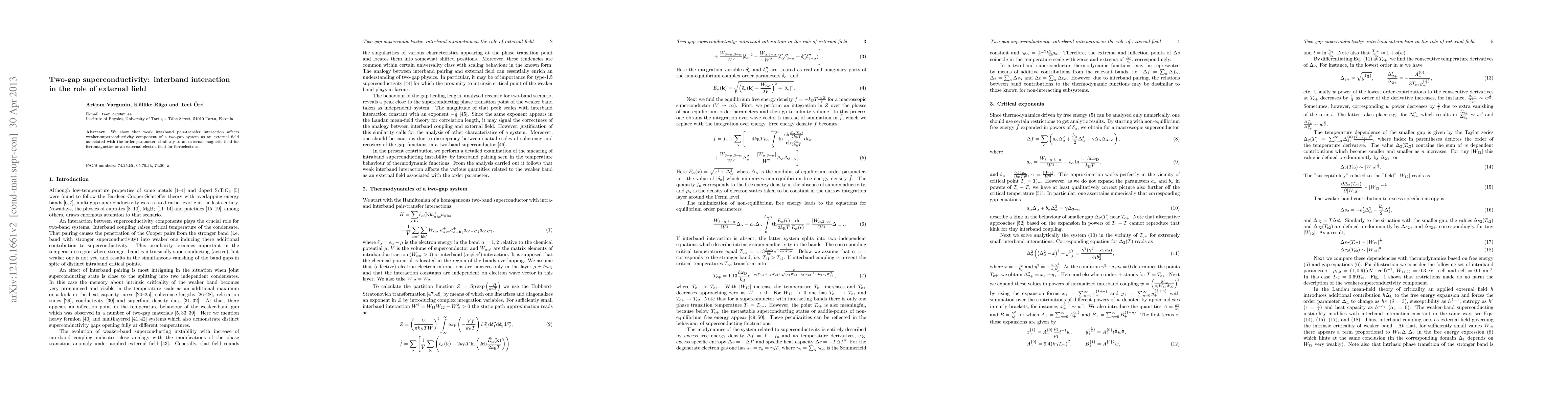 We show that weak interband pair-transfer interaction affects weaker-superconductivity component of a two-gap system as an external field associated with the order parameter, similarly to an external magnetic field for ferromagnetics or an external electric field for ferroelectrics.