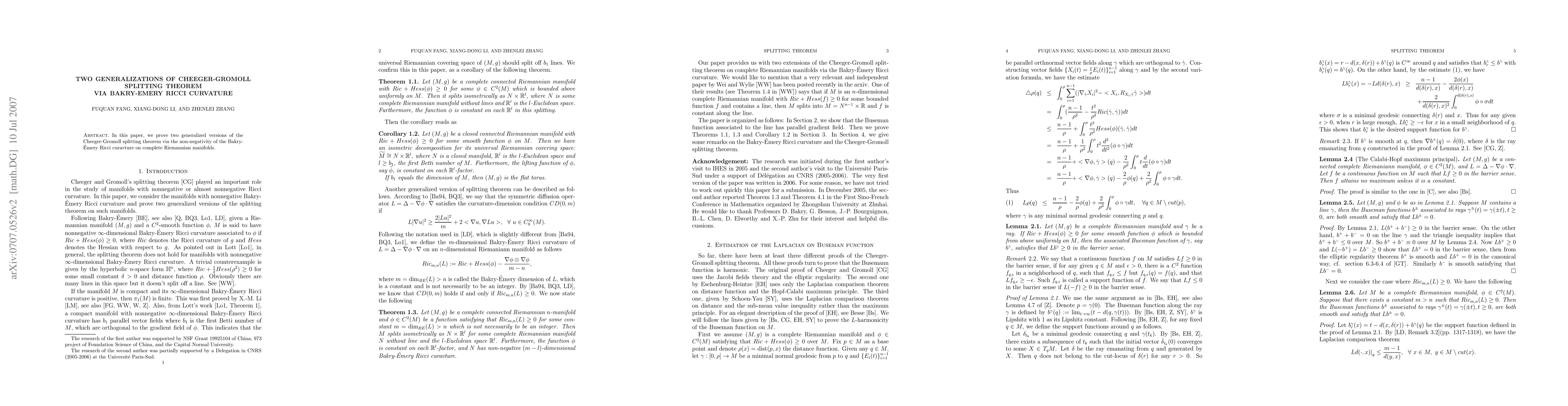 Summary: This paper proves two generalized versions of the Cheeger-Gromoll splitting theorem using the non-negativity of Bakry-Émery Ricci curvature on complete Riemannian manifolds, extending existing geometric results.