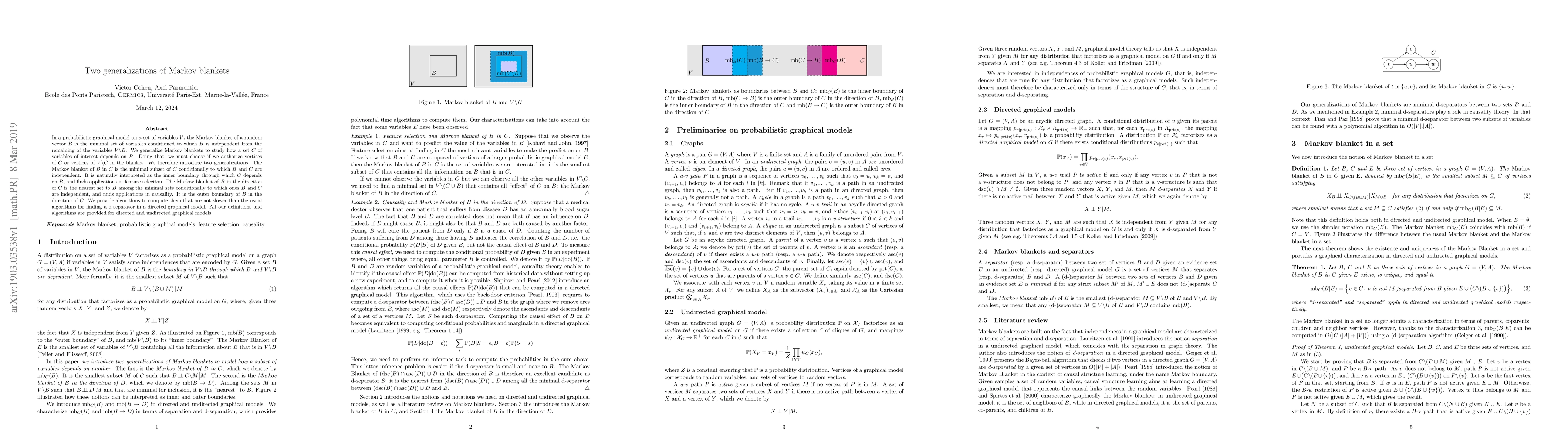 In a probabilistic graphical model on a set of variables $V$, the Markov blanket of a random vector $B$ is the minimal set of variables conditioned to which $B$ is independent from the remaining of the variables $V \backslash B$. We generalize Markov blankets to study how a set $C$ of variables of interest depends on~$B$. Doing that, we must choose if we authorize vertices of $C$ or vertices of $V \backslash C$ in the blanket. We therefore introduce two generalizations. The Markov blanket of $B$ in $C$ is the minimal subset of $C$ conditionally to which $B$ and $C$ are independent. It is naturally interpreted as the inner boundary through which $C$ depends on $B$, and finds applications in feature selection. The Markov blanket of $B$ in the direction of $C$ is the nearest set to $B$ among the minimal sets conditionally to which ones $B$ and $C$ are independent, and finds applications in causality. It is the outer boundary of $B$ in the direction of $C$. We provide algorithms to compute them that are not slower than the usual algorithms for finding a d-separator in a directed graphical model. All our definitions and algorithms are provided for directed and undirected graphical models.