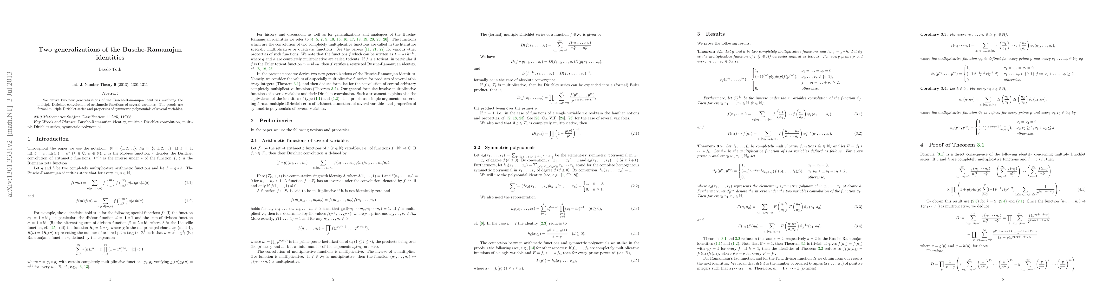 This paper presents two novel generalizations of the Busche-Ramanujan identities, derived using formal multiple Dirichlet series and symmetric polynomial properties. These generalizations involve the convolution of multiple arithmetic functions across several variables.