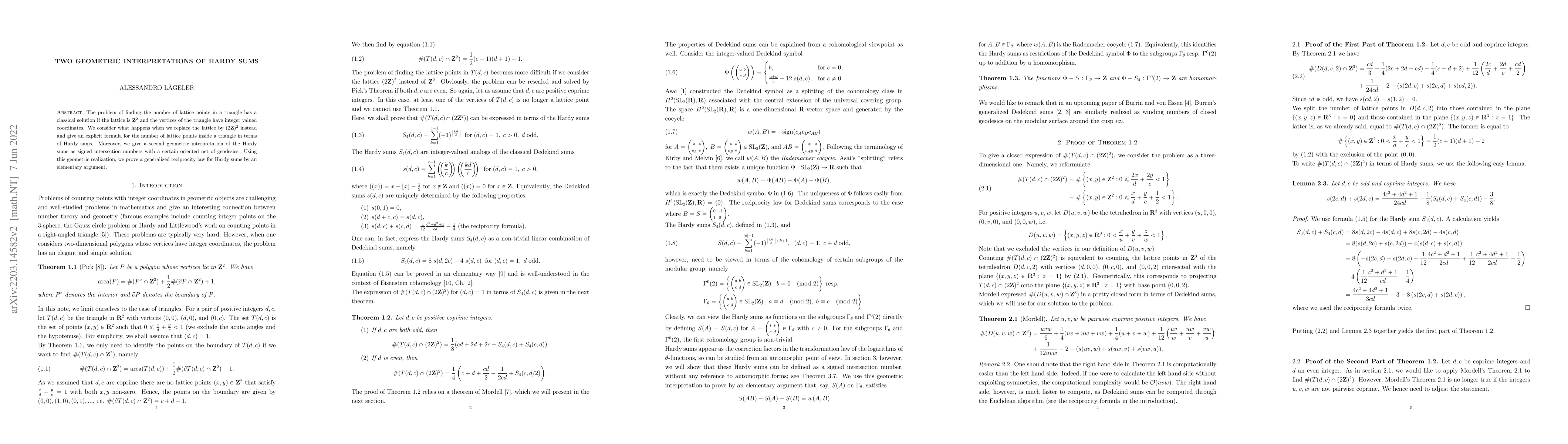 The problem of finding the number of lattice points in a triangle has a classical solution if the lattice is $\mathbf{Z}^2$ and the vertices of the triangle have integer valued coordinates. We consider what happens when we replace the lattice by $(2 \mathbf{Z})^2$ instead and give an explicit formula for the number of lattice points inside a triangle in terms of Hardy sums. Moreover, we give a second geometric interpretation of the Hardy sums as signed intersection numbers with a certain oriented net of geodesics. Using this geometric realization, we prove a generalized reciprocity law for Hardy sums by an elementary argument.