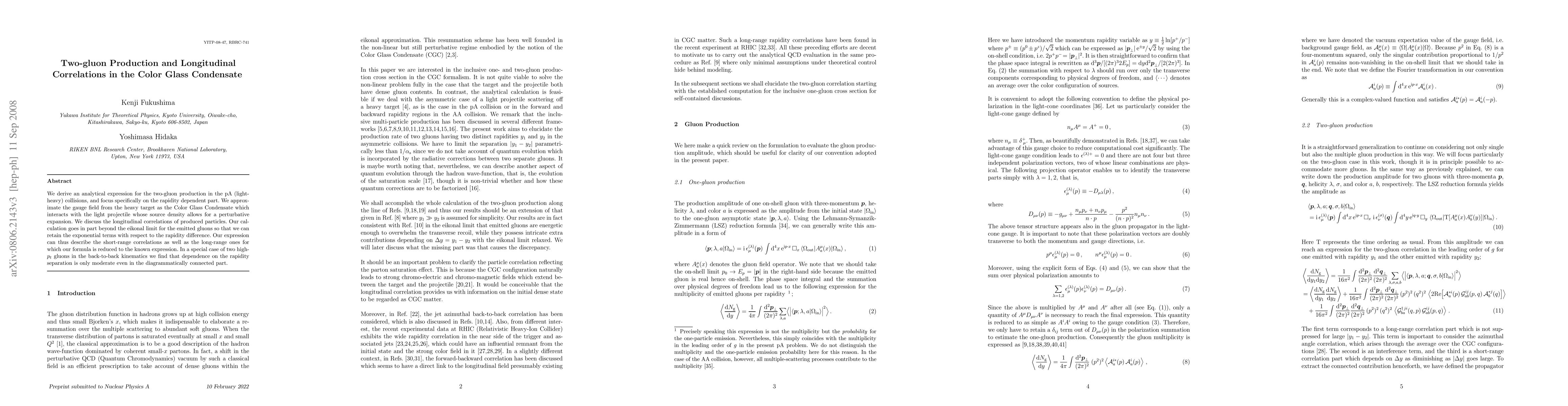 We derive an analytical expression for the two-gluon production in the pA (light-heavy) collisions, and focus specifically on the rapidity dependent part. We approximate the gauge field from the heavy target as the Color Glass Condensate which interacts with the light projectile whose source density allows for a perturbative expansion. We discuss the longitudinal correlations of produced particles. Our calculation goes in part beyond the eikonal limit for the emitted gluons so that we can retain the exponential terms with respect to the rapidity difference. Our expression can thus describe the short-range correlations as well as the long-range ones for which our formula is reduced to the known expression. In a special case of two high-pt gluons in the back-to-back kinematics we find that dependence on the rapidity separation is only moderate even in the diagrammatically connected part.