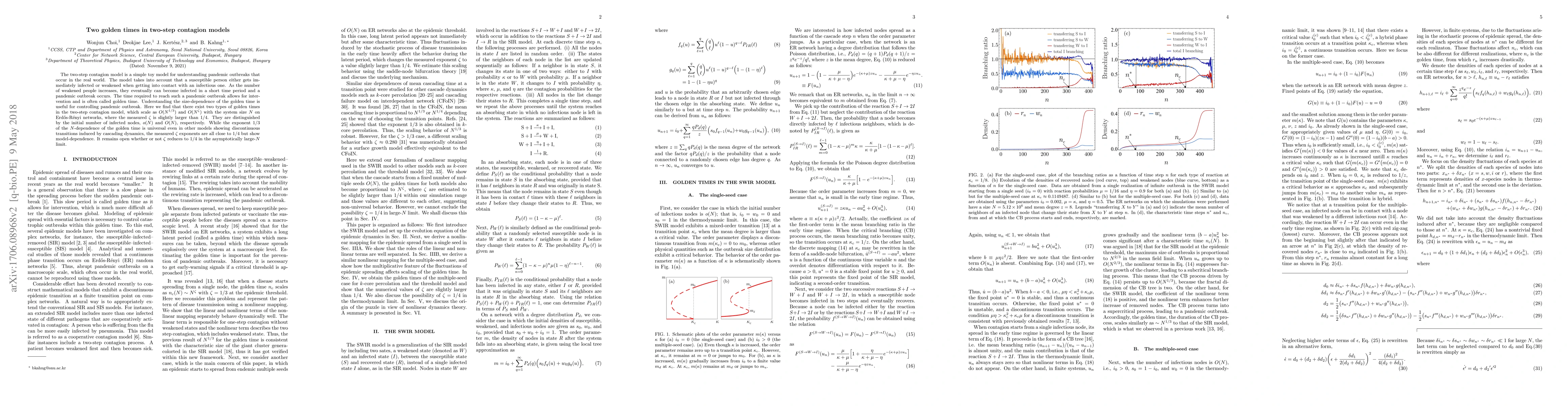 The two-step contagion model is a simple toy model for understanding pandemic outbreaks that occur in the real world. The model takes into account that a susceptible person either gets immediately infected or weakened when getting into contact with an infectious one. As the number of weakened people increases, they eventually can become infected in a short time period and a pandemic outbreak occurs. The time required to reach such a pandemic outbreak allows for intervention and is often called golden time. Understanding the size-dependence of the golden time is useful for controlling pandemic outbreak. Here we find that there exist two types of golden times in the two-step contagion model, which scale as $O(N^{1/3})$ and $O(N^{\zeta})$ with the system size $N$ on Erd\H{o}s-R\'enyi networks, where the measured $\zeta$ is slightly larger than $1/4$. They are distinguished by the initial number of infected nodes, $o(N)$ and $O(N)$, respectively. While the exponent $1/3$ of the $N$-dependence of the golden time is universal even in other models showing discontinuous transitions induced by cascading dynamics, the measured $\zeta$ exponents are all close to $1/4$ but show model-dependence. It remains open whether or not $\zeta$ reduces to $1/4$ in the asymptotically large-$N$ limit.
