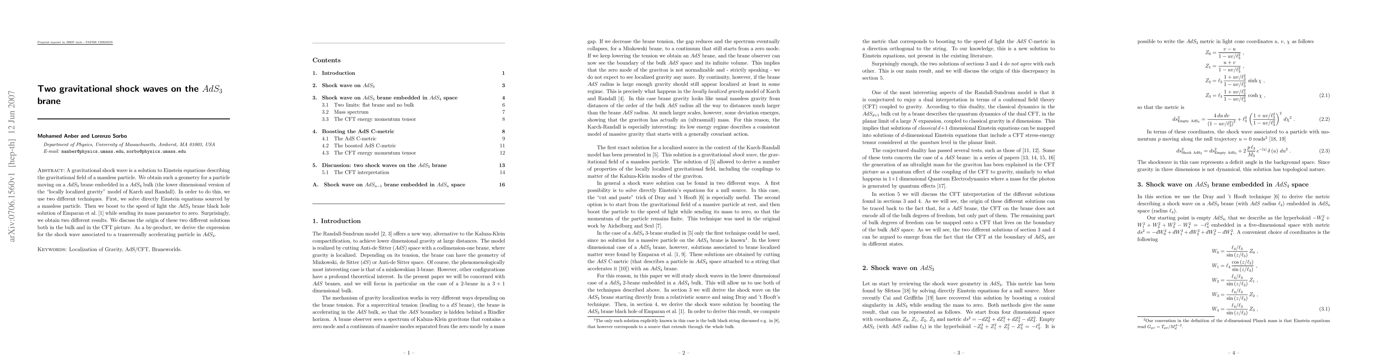 A gravitational shock wave is a solution to Einstein equations describing the gravitational field of a massless particle. We obtain such a geometry for a particle moving on a AdS_3 brane embedded in a AdS_4 bulk (the lower dimensional version of the "locally localized gravity" model of Karch and Randall). In order to do this, we use two different techniques. First, we solve directly Einstein equations sourced by a massless particle. Then we boost to the speed of light the AdS_3 brane black hole solution of Emparan et al while sending its mass parameter to zero. Surprisingly, we obtain two different results. We discuss the origin of these two different solutions both in the bulk and in the CFT picture. As a by-product, we derive the expression for the shock wave associated to a transversally accelerating particle in AdS_4.