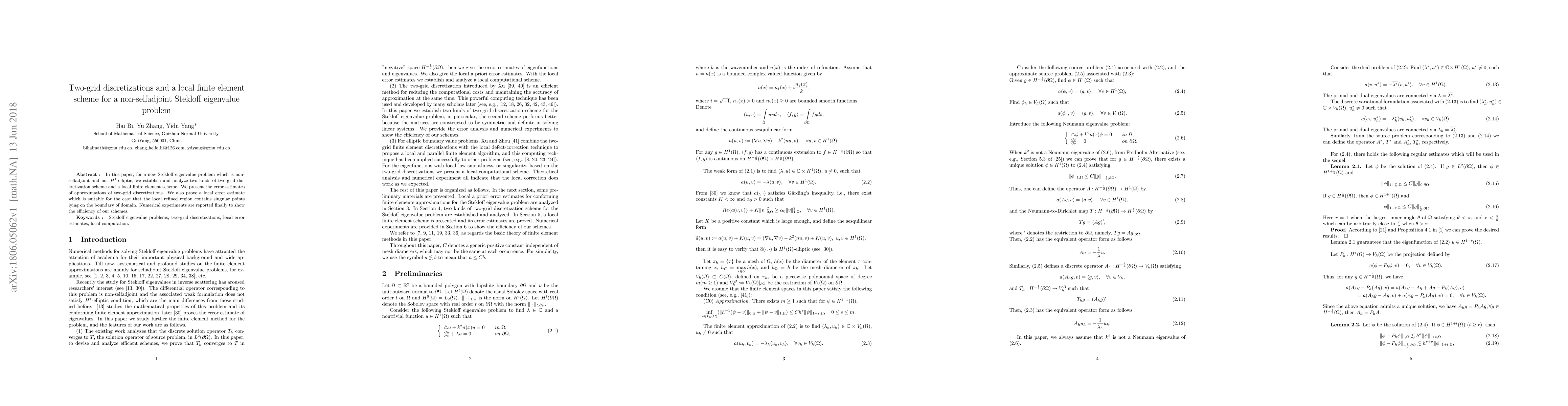 In this paper, for a new Stekloff eigenvalue problem which is non-selfadjoint and not $H^1$-elliptic, we establish and analyze two kinds of two-grid discretization scheme and a local finite element scheme. We present the error estimates of approximations of two-grid discretizations. We also prove a local error estimate which is suitable for the case that the local refined region contains singular points lying on the boundary of domain. Numerical experiments are reported finally to show the efficiency of our schemes.