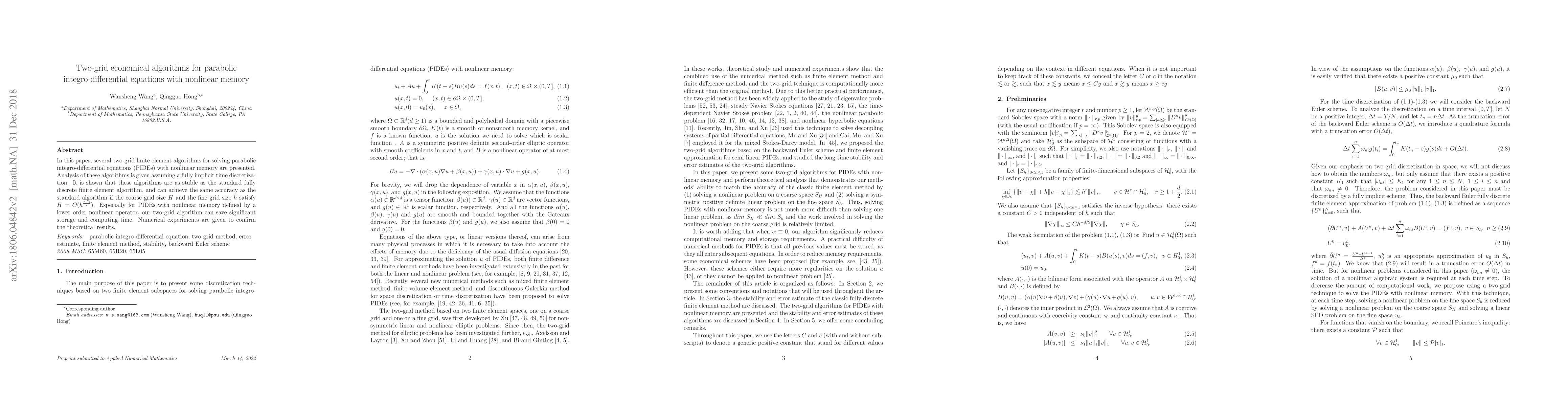 This paper presents two-grid finite element algorithms for solving parabolic integro-differential equations with nonlinear memory, demonstrating stability and accuracy comparable to standard methods. The two-grid approach notably reduces computational costs and storage for equations defined by lower order nonlinear operators, confirmed by numerical experiments.