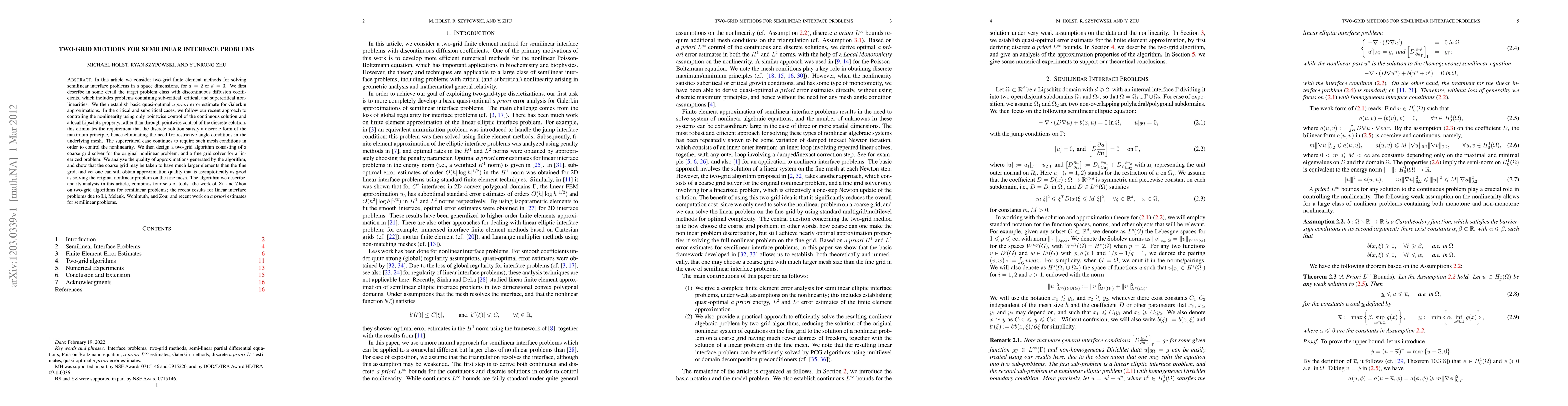 In this article we consider two-grid finite element methods for solving semilinear interface problems in d space dimensions, for d=2 or d=3. We first describe in some detail the target problem class with discontinuous diffusion coefficients, which includes problems containing sub-critical, critical, and supercritical nonlinearities. We then establish basic quasi-optimal a priori error estimate for Galerkin approximations. In the critical and subcritical cases, we follow our recent approach to controling the nonlinearity using only pointwise control of the continuous solution and a local Lipschitz property, rather than through pointwise control of the discrete solution; this eliminates the requirement that the discrete solution satisfy a discrete form of the maximum principle, hence eliminating the need for restrictive angle conditions in the underlying mesh. The supercritical case continues to require such mesh conditions in order to control the nonlinearity. We then design a two-grid algorithm consisting of a coarse grid solver for the original nonlinear problem, and a fine grid solver for a linearized problem. We analyze the quality of approximations generated by the algorithm, and show that the coarse grid may be taken to have much larger elements than the fine grid, and yet one can still obtain approximation quality that is asymptotically as good as solving the original nonlinear problem on the fine mesh. The algorithm we describe, and its analysis in this article, combines four sets of tools: the work of Xu and Zhou on two-grid algorithms for semilinear problems; the recent results for linear interface problems due to Li, Melenk, Wohlmuth, and Zou; recent work on the Poisson-Boltzmann equation; and recent work on a priori estimates for semilinear problems.
