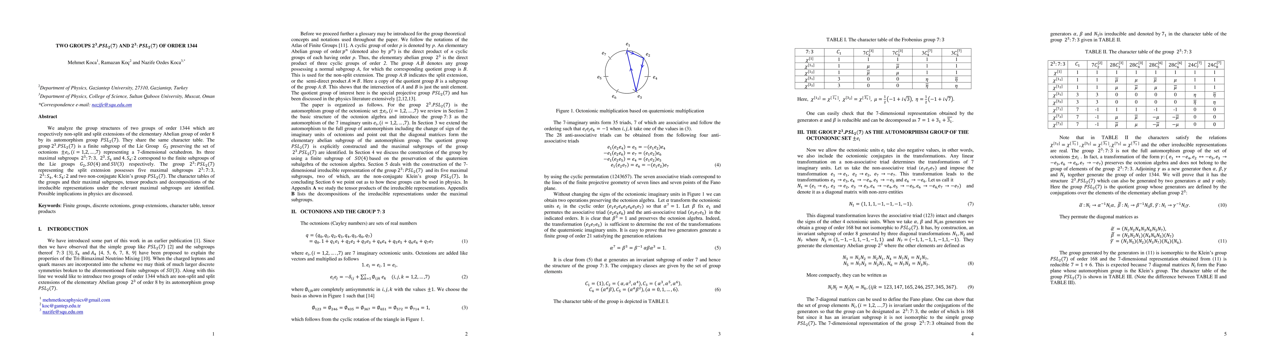 This paper examines the group structures of two groups of order 1344, the non-split 2^3.PSL_2(7) and split 2^3:PSL_2(7) extensions of an elementary Abelian group by PSL_2(7), finding they share the same character table. It explores their maximal subgroups and implications in physics, particularly in the context of Lie groups G_2, SO(4), and SU(3).