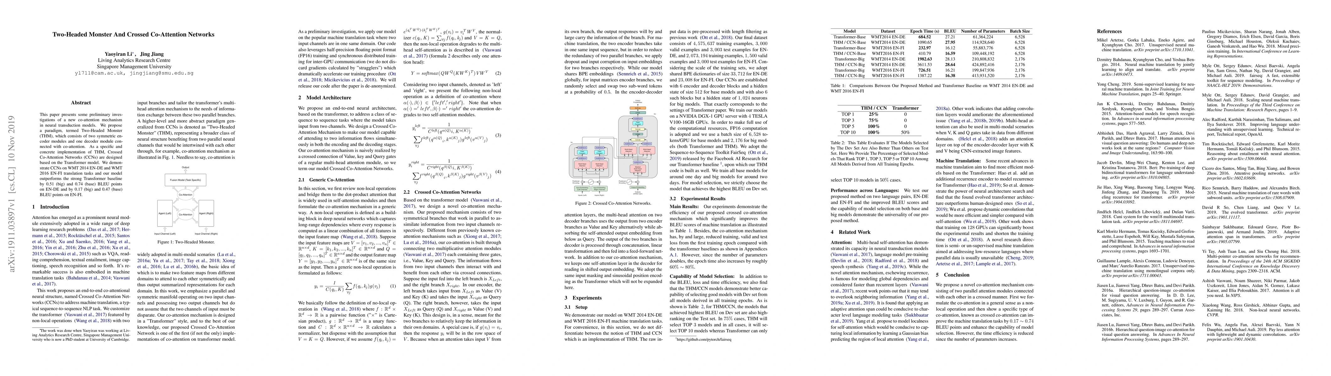 This paper introduces the Two-Headed Monster (THM) co-attention mechanism, featuring two symmetric encoders and one decoder, and implements it as Crossed Co-Attention Networks (CCNs) based on the Transformer model. The proposed model achieves superior performance over the Transformer baseline on WMT 2014 EN-DE and WMT 2016 EN-FI translation tasks.