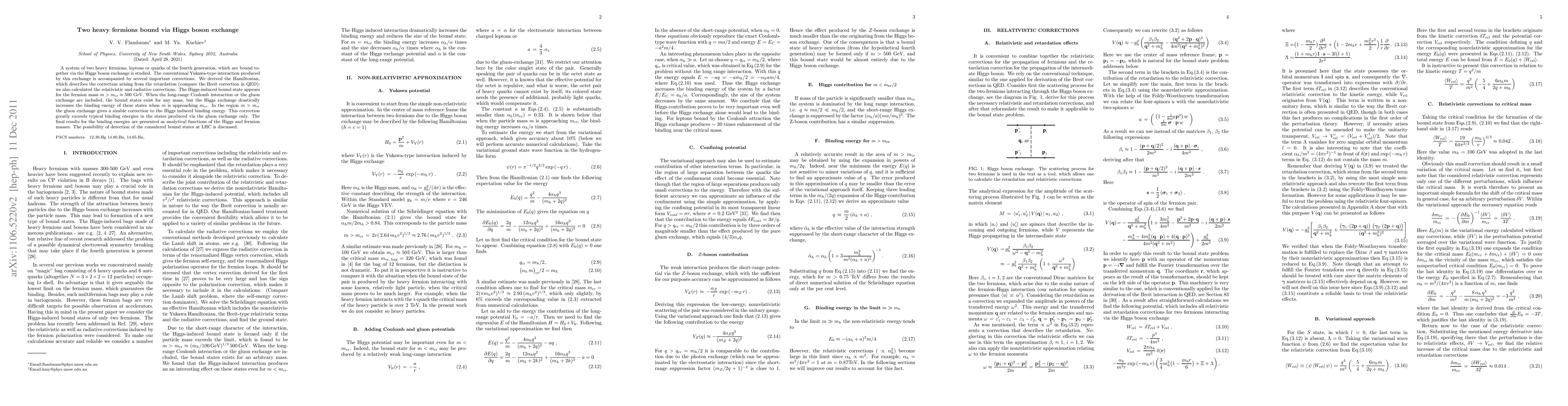 A system of two heavy fermions, leptons or quarks of the fourth generation, which are bound together via the Higgs boson exchange is studied. The conventional Yukawa-type interaction produced by this exchange is accompanied by several important corrections. We derived the Hamiltonian, which describes the correction arising from the retardation (compare the Breit correction in QED); we also calculated the relativistic and radiative corrections. The Higgs-induced bound state appears for the fermion mass m>m_{cr} \approx 500 GeV. When the long-range Coulomb interaction or the gluon exchange are included, the bound states exist for any mass, but the Higgs exchange drastically increases the binding energy of these states when m is approaching m_{cr}. In the region m>m_{cr} the gluon exchange gives a sizable correction to the Higgs induced binding energy. This correction greatly exceeds typical binding energies in the states produced via the gluon exchange only. The possibility of detection of the considered bound states at LHC is discussed.