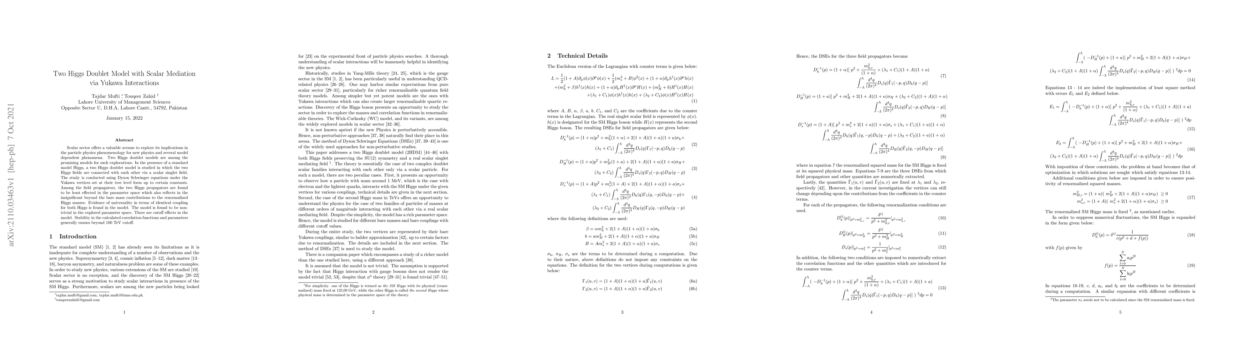 A Two Higgs doublet model with scalar mediation via Yukawa interactions is explored for its implications in particle physics phenomenology, revealing evidence of universality and stability beyond a 100 TeV cutoff.