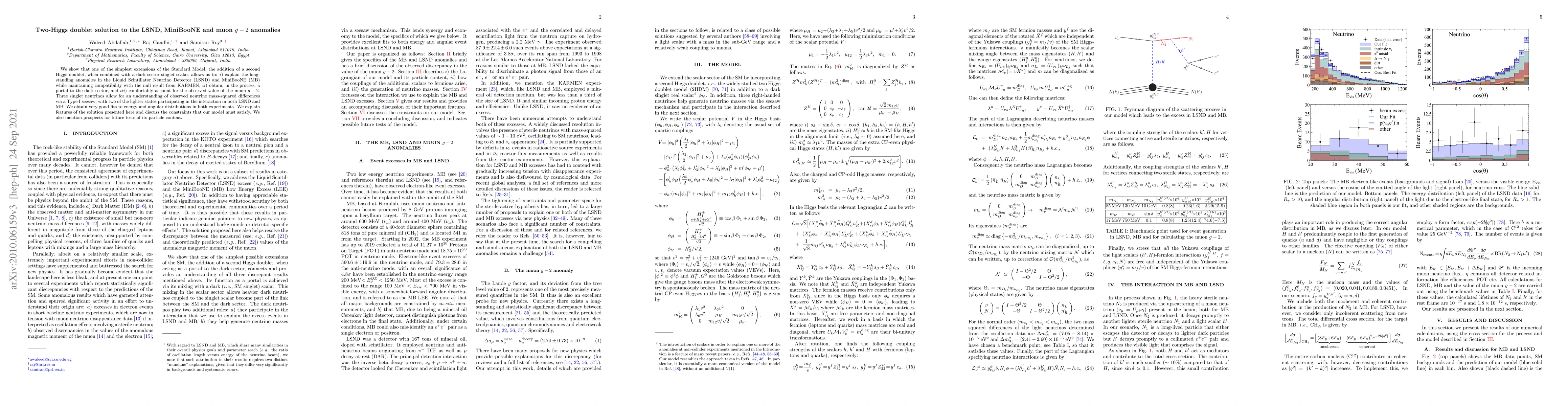 We show that one of the simplest extensions of the Standard Model, the addition of a second Higgs doublet, when combined with a dark sector singlet scalar, allows us to: $i)$ explain the long-standing anomalies in the Liquid Scintillator Neutrino Detector (LSND) and MiniBooNE (MB) while maintaining compatibility with the null result from KARMEN, $ii)$ obtain, in the process, a portal to the dark sector, and $iii)$ comfortably account for the observed value of the muon $g-2$. Three singlet neutrinos allow for an understanding of observed neutrino mass-squared differences via a Type I seesaw, with two of the lighter states participating in the interaction in both LSND and MB. We obtain very good fits to energy and angular distributions in both experiments. We explain features of the solution presented here and discuss the constraints that our model must satisfy. We also mention prospects for future tests of its particle content.