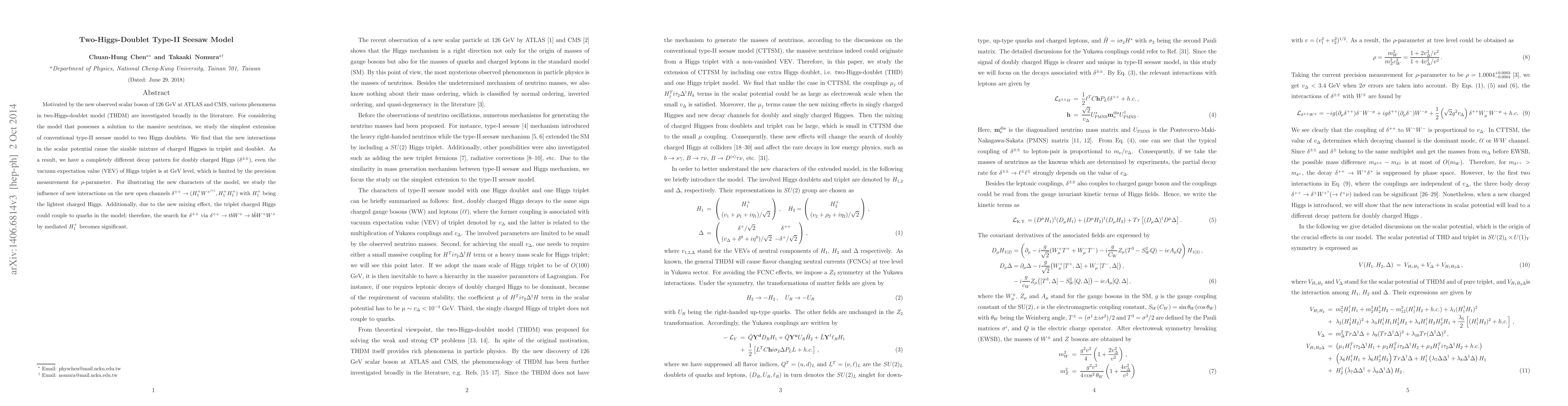 Motivated by the new observed scalar boson of 126 GeV at ATLAS and CMS, various phenomena in two-Higgs-doublet model (THDM) are investigated broadly in the literature. For considering the model that possesses a solution to the massive neutrinos, we study the simplest extension of conventional type-II seesaw model to two Higgs doublets. We find that the new interactions in the scalar potential cause the sizable mixture of charged Higgses in triplet and doublet. As a result, we have a completely different decay pattern for doubly charged Higgs ($\delta^{\pm\pm}$), even the vacuum expectation value (VEV) of Higgs triplet is at GeV level, which is limited by the precision measurement for $\rho$-parameter. For illustrating the new characters of the model, we study the influence of new interactions on the new open channels $\delta^{++}\to ( H^+_1 W^{+^{(*)}}, H^+_1 H^+_1)$ with $H^+_1$ being the lightest charged Higgs. Additionally, due to the new mixing effect, the triplet charged Higgs could couple to quarks in the model; therefore, the search for $\delta^{++}$ via $\delta^{++}\to tb W^+ \to b \bar b W^+ W^+$ by mediated $H^+_{1}$ becomes significant.