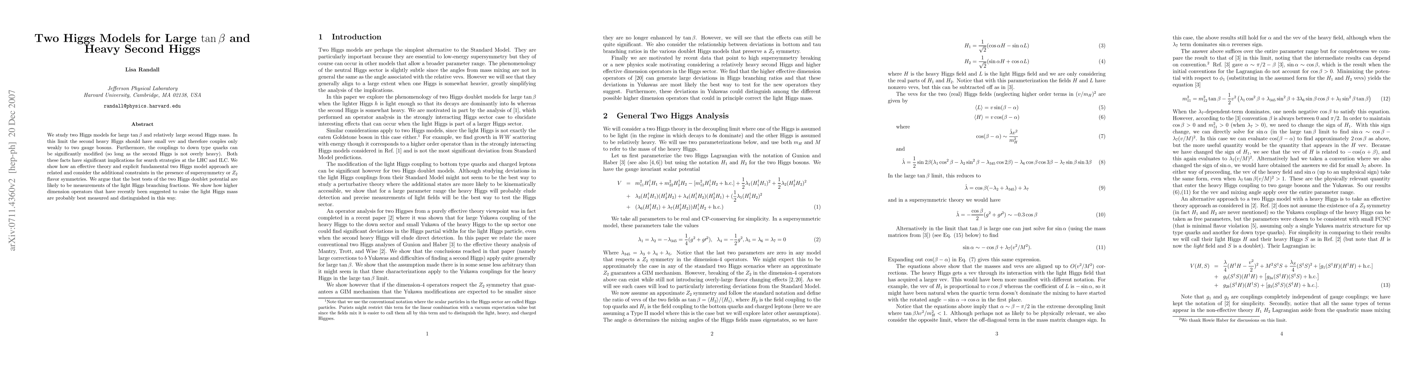 This paper investigates two Higgs models for large $\tan\beta$ and heavy second Higgs masses, highlighting their weak coupling to gauge bosons and modified down-type quark interactions. It discusses the implications for LHC and ILC searches and suggests that light Higgs branching fractions provide the best tests for these models.