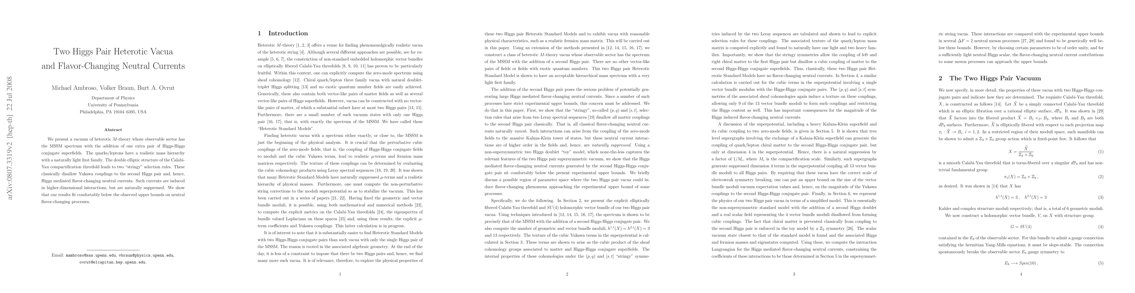 We present a vacuum of heterotic M-theory whose observable sector has the MSSM spectrum with the addition of one extra pair of Higgs-Higgs conjugate superfields. The quarks/leptons have a realistic mass hierarchy with a naturally light first family. The double elliptic structure of the Calabi-Yau compactification threefold leads to two ``stringy'' selection rules. These classically disallow Yukawa couplings to the second Higgs pair and, hence, Higgs mediated flavor-changing neutral currents. Such currents are induced in higher-dimensional interactions, but are naturally suppressed. We show that our results fit comfortably below the observed upper bounds on neutral flavor-changing processes.