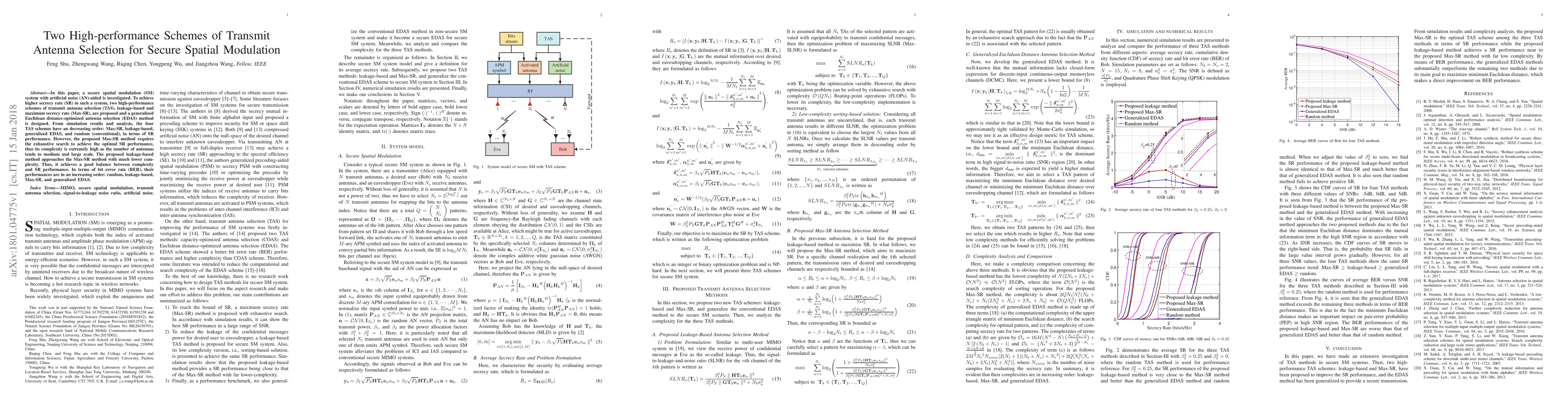 This paper proposes two high-performance transmit antenna selection schemes—leakage-based and maximum secrecy rate—to enhance the secrecy rate in secure spatial modulation systems. The leakage-based method offers a good balance between complexity and performance, while the maximum secrecy rate method achieves the best performance but at a high computational cost.
