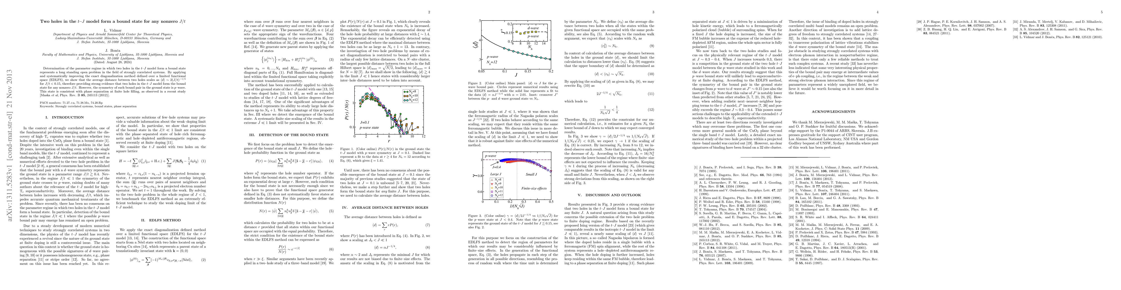 Determination of the parameter regime in which two holes in the t-J model form a bound state represents a long standing open problem in the field of strongly correlated systems. By applying and systematically improving the exact diagonalization method defined over a limited functional space (EDLFS), we show that the average distance between two holes scales as $\langle d \rangle \sim 2 (J/t)^{-1/4}$ for J/t < 0.15, therefore providing strong evidence that two holes in the t-J model form the bound state for any nonzero J/t. However, the symmetry of such bound pair in the ground state is p-wave. This state is consistent with phase separation at finite hole filling, as observed in a recent study [Maska et al, Phys. Rev. B 85, 245113 (2012)].