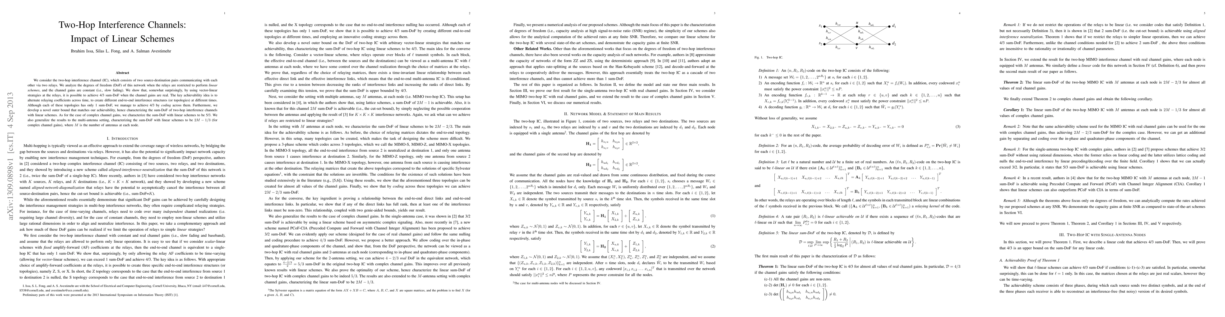 We consider the two-hop interference channel (IC), which consists of two source-destination pairs communicating with each other via two relays. We analyze the degrees of freedom (DoF) of this network when the relays are restricted to perform linear schemes, and the channel gains are constant (i.e., slow fading). We show that, somewhat surprisingly, by using vector-linear strategies at the relays, it is possible to achieve 4/3 sum-DoF when the channel gains are real. The key achievability idea is to alternate relaying coefficients across time, to create different end-to-end interference structures (or topologies) at different times. Although each of these topologies has only 1 sum-DoF, we manage to achieve 4/3 by coding across them. Furthermore, we develop a novel outer bound that matches our achievability, hence characterizing the sum-DoF of two-hop interference channels with linear schemes. As for the case of complex channel gains, we characterize the sum-DoF with linear schemes to be 5/3. We also generalize the results to the multi-antenna setting, characterizing the sum-DoF with linear schemes to be 2M-1/3 (for complex channel gains), where M is the number of antennas at each node.